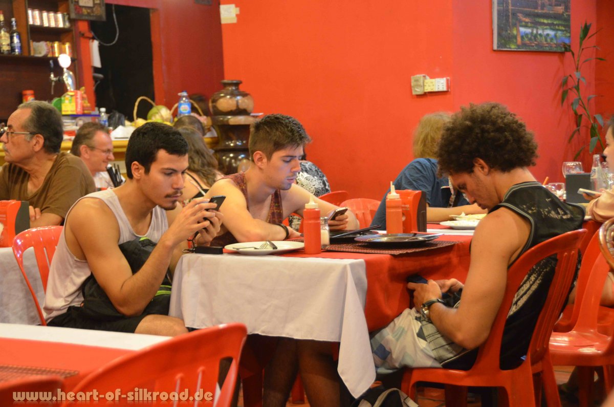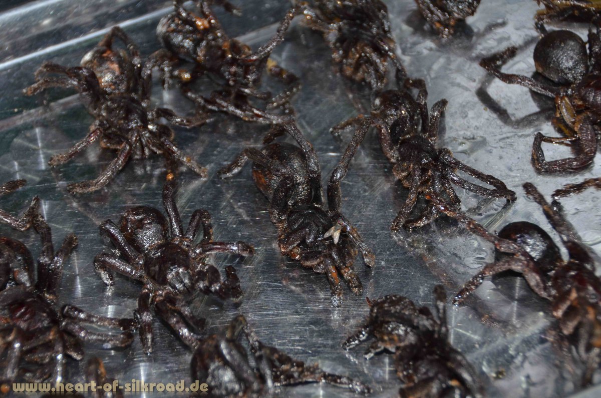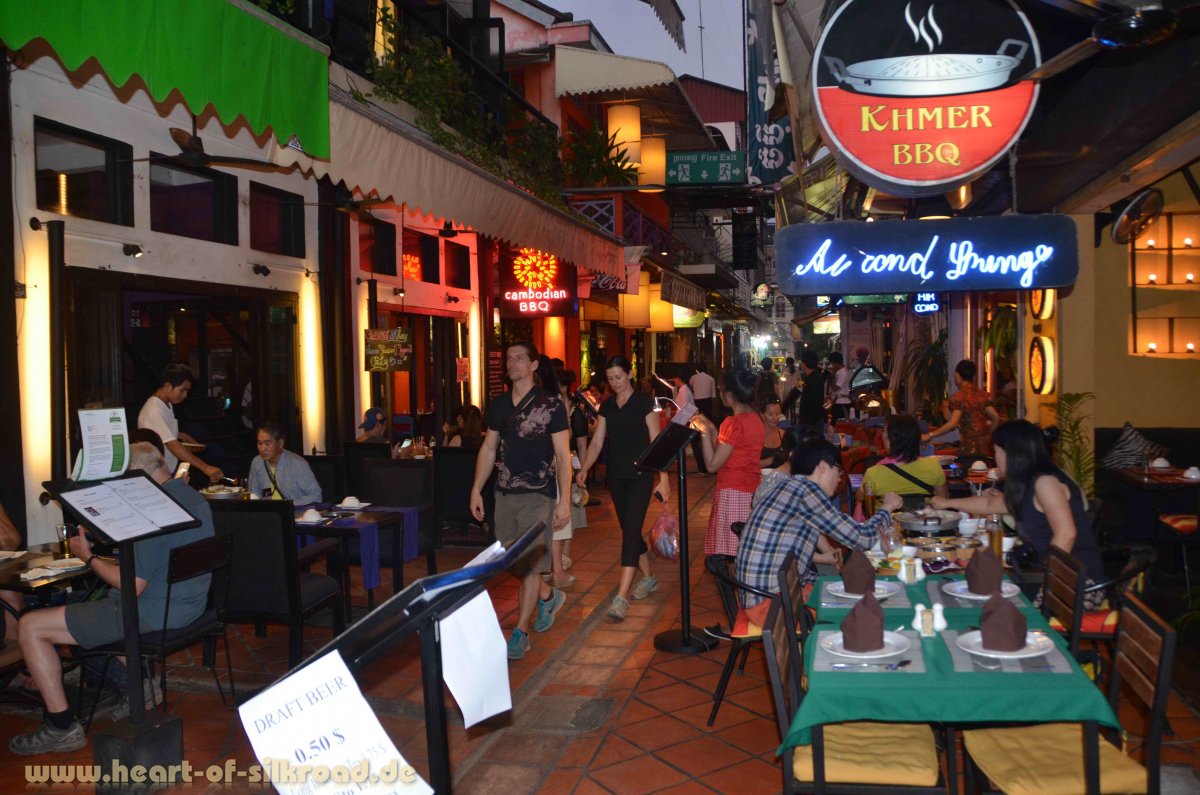 Nach unseren Tempelbesichtigungen ist die quirlige Stadt Siem Reap mit den vielen Bars, Restaurants und dem Nachtmarkt ein willkommener aber auch krasser Gegensatz zum Kulturprogramm. Ein Schmelztiegel vieler Kulturen, ein Sprachgewirr der Touristen aus aller Welt und ein Treffpunkt für Alt und Jung, Urlauber, Kulturfanatiker, Südostasien-Fans, schweigende Smartphone-Surfer … und, und, und. Wir genießen es hier abends einkaufen und essen zu gehen. Auf frittierte Taranteln und Schlagen am Spieß haben wir allerdings lieber verzichtet.