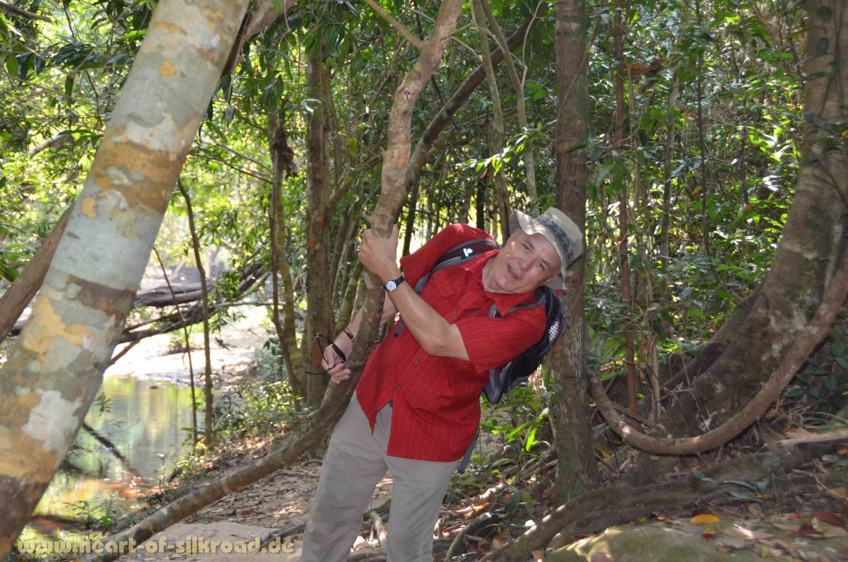 Ausgangspunkt für unsere Tempelbesichtigungen ist die Stadt Siem Reap, wo wir uns ein 3 Tages-Ticket kaufen. Die Tempelanlagen sind sehr weitläufig. Um den Besucherströmen zu entgehen starten wir azyklisch ab 7 Uhr morgens unsere Besichtigungstour. Angkor Wat ist der größte und auch bekannteste Tempel, der von den Touristen geradezu überrannt wird. Sehr mystisch wirken aber jene Tempel, die von den riesigen Würgefeigen überwuchert sind. Angkor Thom, die große Stadt, war die letzte Hauptstadt der Khmer. Ein noch größerer Burggraben und noch wehrhaftere größere Mauern als bei den älteren Anlagen von immerhin 12 Kilometern Länge und acht Meter Höhe sollten Eindringlinge und Plünderer abschrecken. Heute hat der Dschungel auch diese Anlage erobert. Uns beeindruckt besonders der Bayon-Tempel mit dem ewigen Lächeln der großen Steingesichter. 50 Kilometer außerhalb von Siem Reap liegt Kbal Spean, wo wir nach einer Wanderung durch den Dschungel einen fast ausgetrockneten Fluss, auch „Fluss der Tausend Lingas“ genannt, erreichen. Aus dem Gestein des Flussbettes wurden kunstvolle Phallussymbole sowie Skulpturen von Hindugottheiten herausgemeißelt.