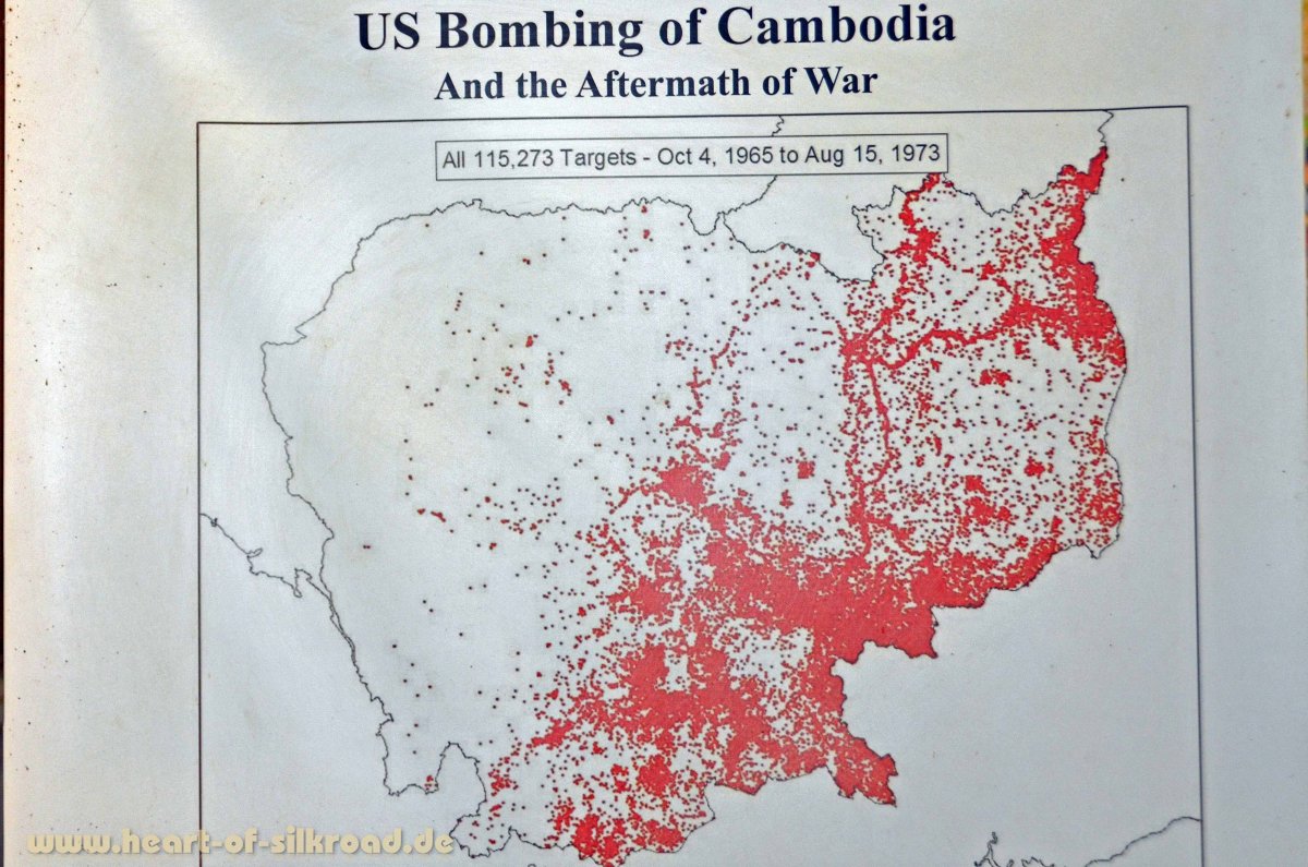 Aber Kambodscha hat auch eine sehr grausame Zeit unter der Herrschaft der Roten Khmer erlebt. Zum besseren Verständnis der heutigen Situation ist ein Blick in die Vergangenheit erforderlich: 1887 hatte Frankreich sein Kolonialreich Indochina aus den drei Ländern Vietnam, Laos und Kambodscha gegründet. Die Kambodschaner erhofften sich von Frankreich Unterstützung, da die Nachbarländer Thailand und Vietnam im 19. Jh. ständig um die Vorherrschaft in Kambodschas kämpften. Doch die Franzosen merkten bald, dass die Ausbeutung des Landes in Bezug auf Bodenschätze und Wälder nicht so viel einbringen würde wie erhofft und taten nur das Allernotwendigste für die Entwicklung des Landes. Als sich Frankreich 1954 zurückzog und auf alle Ansprüche in Indochina verzichtete, kam König Sihanouk für fast 16 Jahre an die Macht. In dieser Zeit war Kambodscha eines der reichsten Länder Südostasiens. Doch als der Vietnamkrieg auch auf Kambodscha und hier vor allem auf den im Westen des Landes gelegenen Ho Chi Minh Pfad übergriff und die Bombardements der Amerikaner immer heftiger wurden, hatte das verheerende Folgen für das Land. Der Ho Chi Minh Pfad war ein wichtiger Nachschubweg für Waffen, Munition, Lebensmittel und Soldaten aus dem kommunistischen Norden Vietnams zur Unterstützung der Vietcong-Bewegung in ihrem Kampf gegen Südvietnam. Die USA, die Südvietnam unterstützten, griffen ab 1969 Teile von Laos und Kambodscha an, obwohl beide Länder neutral waren. Diese Angriffe waren nach amerikanischem Gesetz illegal und trugen nicht unerheblich dazu bei, dass beide Länder in die „offenen Arme“ der kommunistischen Staaten Nordvietnam, China und der Sowjetunion getrieben wurden. Der „kommunistische Domino-Effekt“, den die Amerikaner durch ihr militärisches Eingreifen in Indochina verhindern wollten, wurde durch den Vietnamkrieg erst richtig ausgelöst und führte später zur schlimmsten Zeit in der Geschichte Kambodschas: der Schreckensherrschaft der Roten Khmer unter Führung vom „Bruder Nr. 1“ Pol Pot.