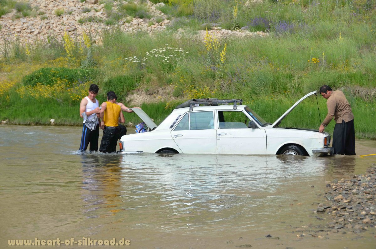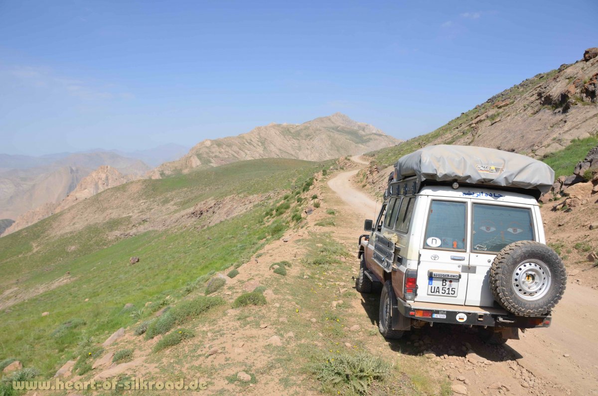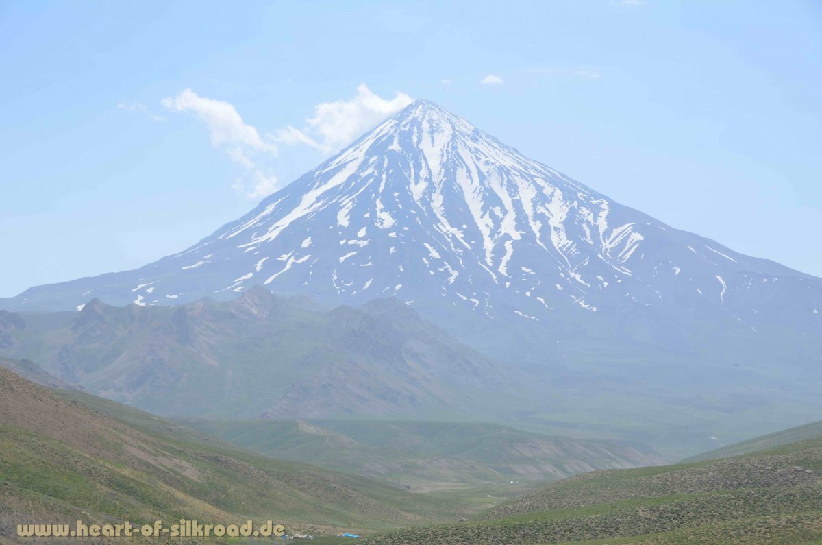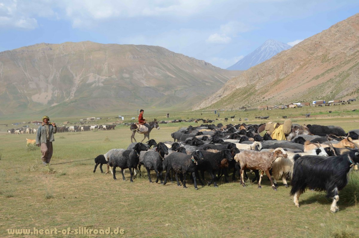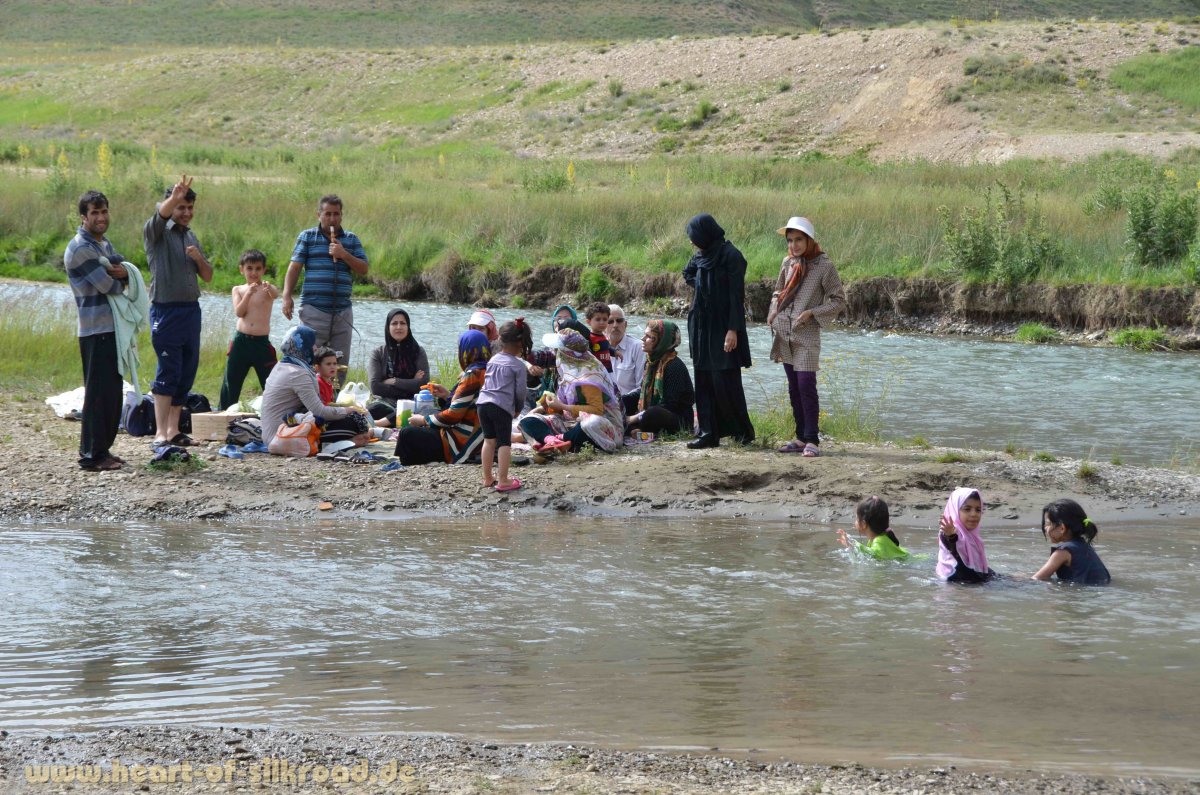 Um der Hitze der Großstadt zu entfliehen, entscheiden wir uns, nach einigen Tagen in die Berge zu fahren. Mit einer Gruppe von iranischen Off-Roadfahrern geht es von Teheran aus für einen Tag in die Damavand-Region. Der Damavand ist mit 5610 Meter der höchste Berg im Iran. Gerade mal 80 Kilometer sind wir aus Teheran raus und stehen in über 3000 Metern Höhe in einer ganz anderen Welt. Hier leben noch Hirten mit ihren Tieren, als wäre die Zeit stehengeblieben, während in der 16 Mio. Metropole Teheran mittlerweile doppelstöckige Autobahnen gebaut wurden, um dem Verkehr Herr zu werden. Wir kommen in den Bergen am Damavand noch an Sinterterrassen, farbenprächtigen Blumenwiesen und türkisblauen Bergseen vorbei bevor wir trotz Ramadan ein reichhaltiges Picknick noch vor Sonnenuntergang erleben. Man erzählt uns, dass sich im Iran nur 10 Prozent der Einwohner tatsächlich an die islamische Fastenzeit halten. Viele Iraner nutzen diese Zeit für Ausflüge in die nähere Umgebung und machen wie wir Picknick, denn wer reist, der muss gemäß Koran nicht fasten.