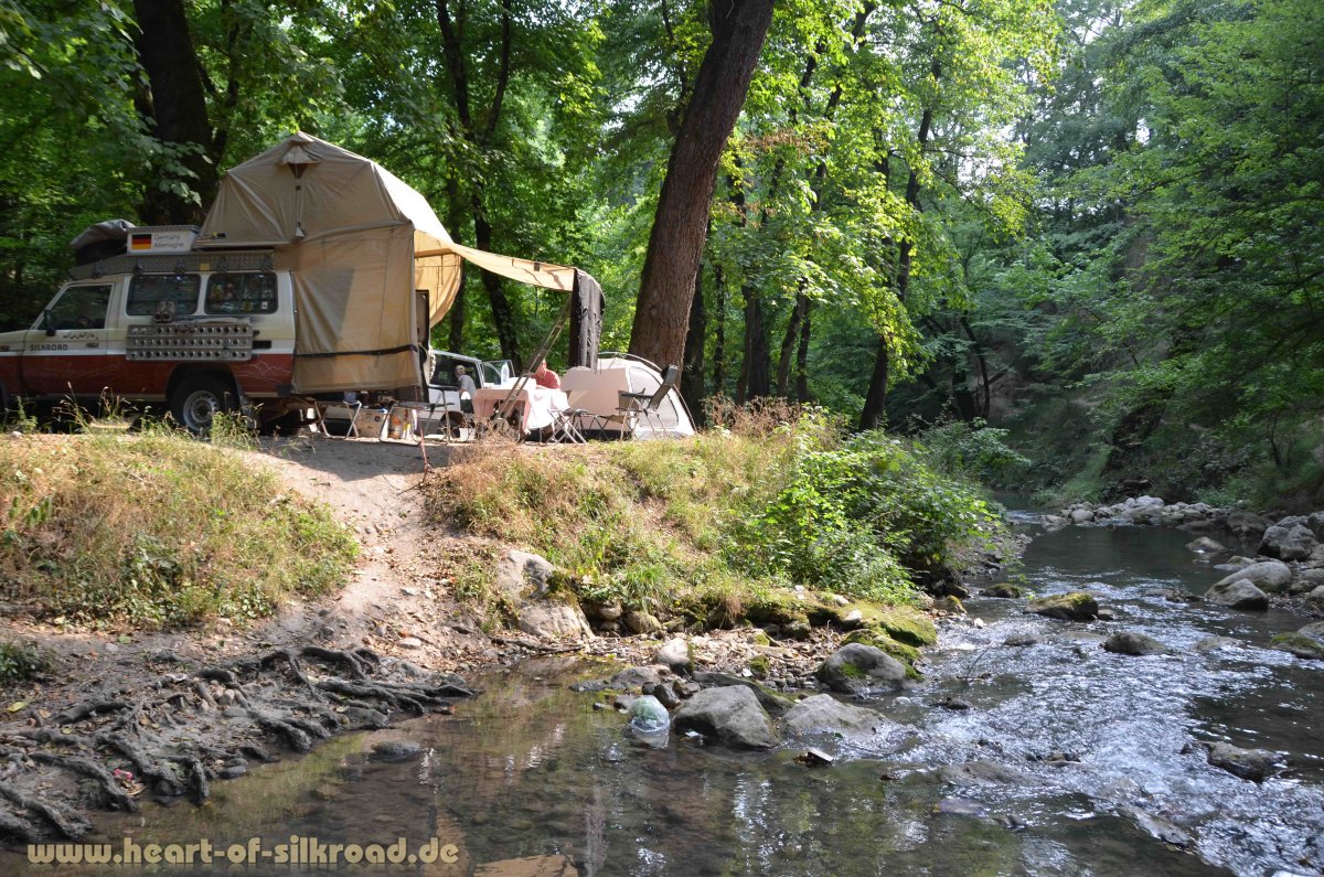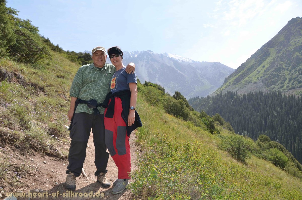 In Kirgisien haben wir in den nächsten drei Wochen längere Trekkingtouren im Tian Shan (Himmelsgebirge) geplant. Das ist notwendig, um uns für die hohen Gebirgspässe in China und Pakistan vorzubereiten. Nur so können wir der gefährlichen Höhenkrankheit vorbeugen, die uns z. B. am Kunjerab Pass mit Höhen von bis zu 4.600 Metern bei einem schnellen Anstieg mit dem Auto droht. Zunächst begeistern uns in Kirgisien die grüne Natur und gemäßigte Temperaturen. Was für ein Kontrast zu den 45 Grad in staubigen Wüsten vor noch einigen Tagen.