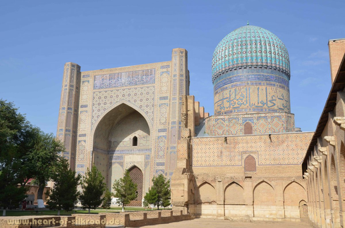 Samarkand ist nur 260 Kilometer von Buchara entfernt und eigentlich schnell zu erreichen, wären da nicht die vielen Polizeikontrollen und Pass-Registrierungen. Hinzu kommt noch ein chaotischer Fahrstil der Einheimischen, besonders der Bus- und Taxifahrer. Samarkand ist für seine riesigen Architekturdenkmäler bekannt, die fast alle zu Zeiten des grausamen Eroberers Timur Lenk Ende des 14. Jh. entstanden. Von der Größe und Einmaligkeit hat die Stadt seit unserem letzten Besuch im Jahr 2006 aber nichts verloren. So ist inzwischen auch die Moschee Bibi Xanon nach einem langjährigen Wiederaufbau fertiggestellt. Wir sind nicht nur von der Größe, sondern auch von den leuchtend blauen und türkisfarbenen Fliesenmosaiken fasziniert.