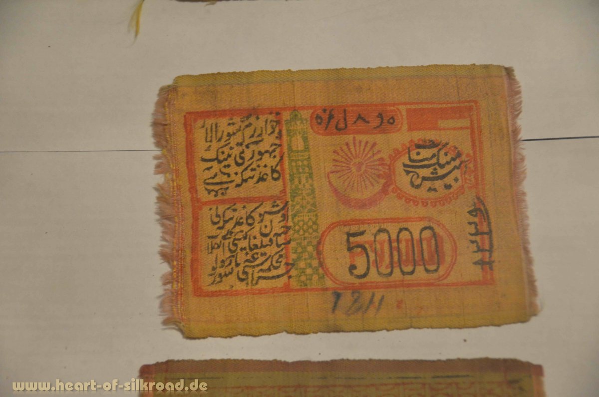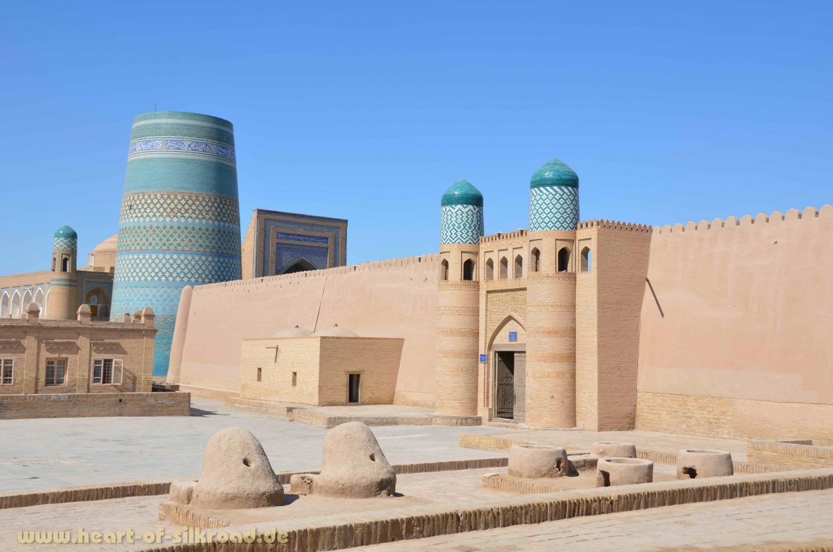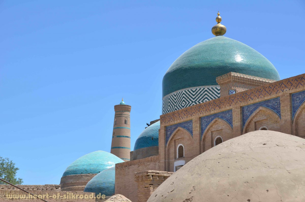 Unser erstes Ziel in Usbekistan ist die alte Karawanenstadt Chiva, die für uns der Inbegriff von „Tausend und einer Nacht“ ist. Die Stadt mit der großen Stadtmauer, einem Palast, Minaretten, Mausoleen und Medresen ist ein lebendiges Freilichtmuseum, wie wir es sonst noch nirgends gesehen haben. Hier leben auch noch über 5000 Usbeken in ihren traditionellen Lehmhäusern. Im örtlichen Museum entdecken wir auch eine kleine Seidenstraßen-Kuriosität: Geldscheine aus Seide, die gewaschen werden konnten. Ob der Begriff „Geldwäsche“ hier seinen Ursprung hat, können wir aber nicht sagen.