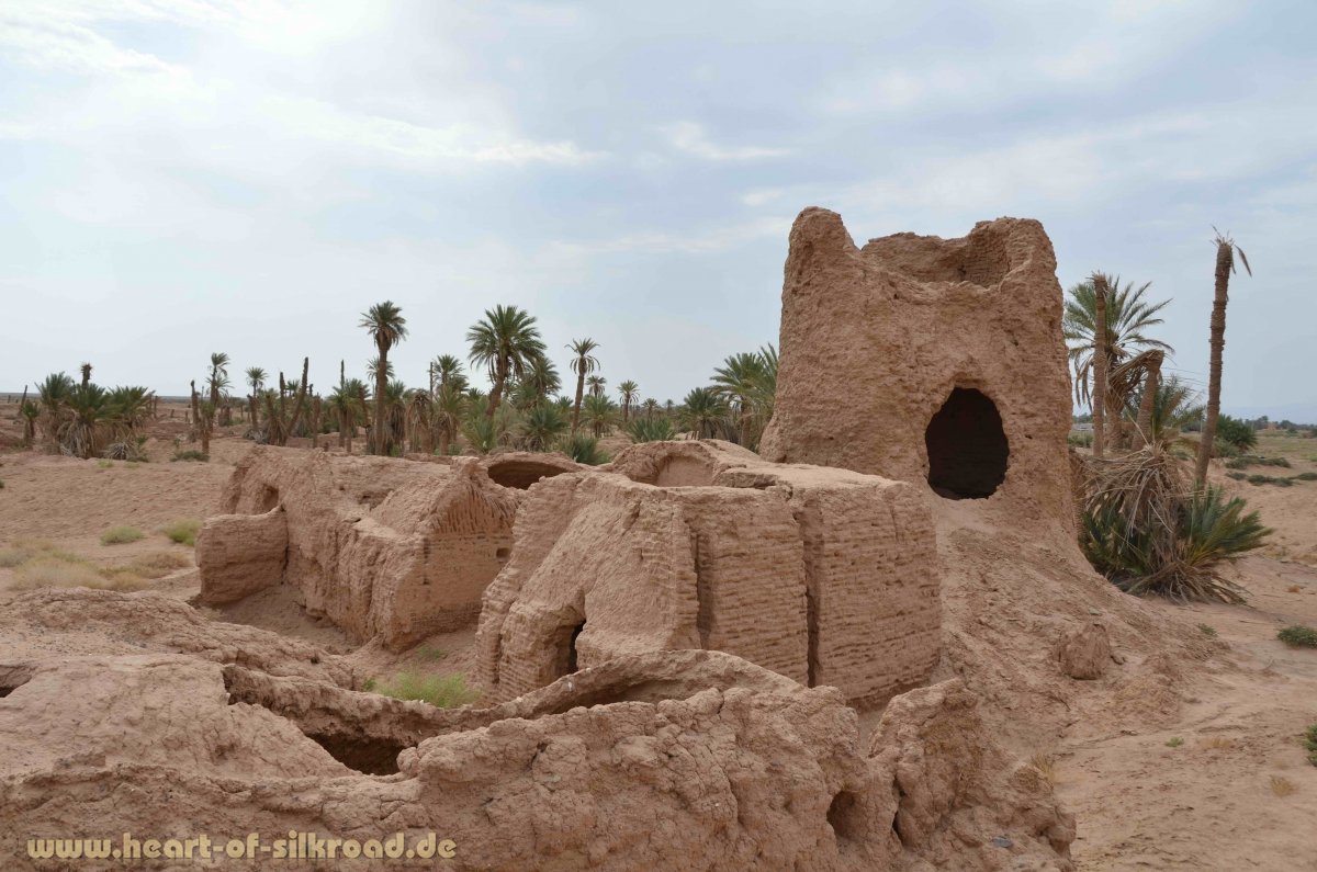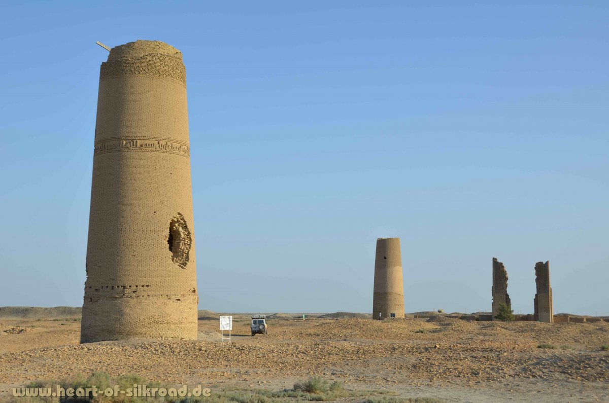 Den Weg mitten in der Wüste finden wir mit Hilfe unseres alten GPS-Punktes von 2002. Drei große Siedlungsperioden erlebte diese Stadt (3000 v. Chr. – 100 n. Chr., 300 – 800 n. Chr. und im Mittelalter). Als das lebenswichtige Wasser aufgrund der Abholzung der Wälder versiegte, wurde die Landschaft immer trockener. Heute kann man in Dekhistan noch die Ruinen von den beiden Minaretten und das Eingangsportal einer Medrese sehen. In den letzten Jahren sind einige weitere Gebäude unter der bis zu 4 Meter Sand- und Lehmschicht freigelegt worden. Der größte Teil liegt aber immer noch unter dem Wüstensand.