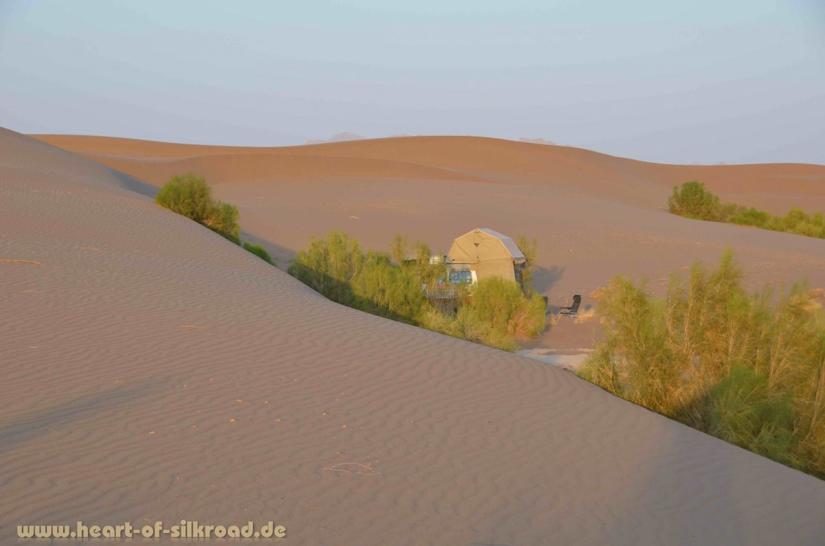 Die ehemaligen Städte an der Seidenstraße wie Yadz oder Bam sowie die historischen Ruinen von Persepolis hatten wir 2002 schon besucht. Wegen der hohen Temperaturen wollen wir aber nicht weiter in Richtung Süden fahren, sondern durchqueren die Salzwüste Dasht-e-Kavir nach Norden, um die Gebirgsregionen am Kaspischen Meer zu erreichen. Dabei stoßen wir immer wieder auf die Ruinen von Karawansereien und verlassenen Oasen. Uns faszinieren diese Karawansereien, obwohl wir schon so viele gesehen haben. Alle 40 Kilometer entlang der Handelsrouten der Seidenstraße gab es diese sogenannten „Kamel-Motels“, die nicht nur ein Umschlagplatz für Waren aller Art, sondern auch eine Stätte der Begegnung und des Austausches von Informationen und Neuigkeiten waren. Aber auch Pilger und Missionare kamen hierher. Es muss damals ein buntes Treiben gewesen sein, von dem heute nur noch Ruinen im Staub und Sand übrig geblieben sind. Auch wenn es für uns unvorstellbar und fast lebensfeindlich wirkt, so treffen wir hier in der Wüste immer wieder auf Menschen mit ihren Tierherden. In den Wüstendörfern wird das wertvolle Wasser seit Jahrhunderten in unterirdischen Wasserspeichern gesammelt und über Windtürme gekühlt. Sozusagen eine „antike Klimaanlage“. Wir finden in der Wüste zwar ein schönes Camp, werden aber in der Nacht von einem Sandsturm heimgesucht, der auch durch die Ritzen unseres Dachzeltes kommt und uns von oben bis unten einpudert.