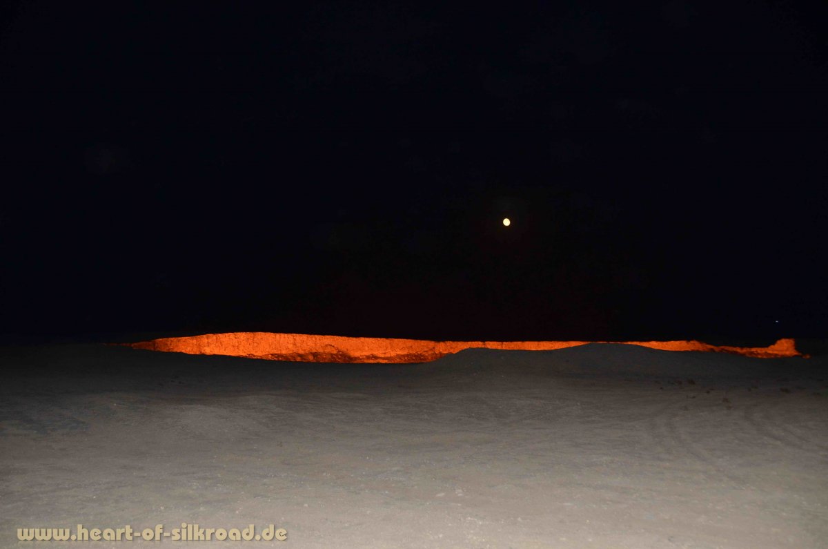 Ein weiteres Highlight bei der knapp 700 Kilometer langen Wüstendurchquerung ist der brennende Gaskrater bei Darwaza. Das eigentliche Wüstendorf Darwaza, wo wir 2002 noch campen konnten, wurde wegen intensiver Gasbohrungen kurzerhand von der Regierung weiter in die Wüste verlegt. Auf der Suche nach Erdgas wurden hier in den siebziger Jahren Explorationsarbeiten ausgeführt. Das Gestein an der Bohrstelle war sehr instabil und stürzte ein, so dass ein Krater von 200 Meter Durchmesser und 50 Meter Tiefe entstand. Das Gas wurde von einem Hirten entzündet, da seine Tiere in der Nähe des austretenden Gases regelmäßig an einer Gasvergiftung starben. Seit dieser Krater brennt, trauen sich die Tiere nicht mehr hierher. Nachts ist der Gaskrater ein Naturschauspiel der ganz besonderen Art. Er wird von den Einheimischen auch als „Tor zur Hölle“ beschrieben. Wir finden den Vergleich mit einer riesigen „Feuerzangenbowle“ aber passender. Das Camp im Windschatten von diesem Kater bei Vollmond und sternenklarer Nacht bleibt für uns ein unvergessliches Erlebnis.