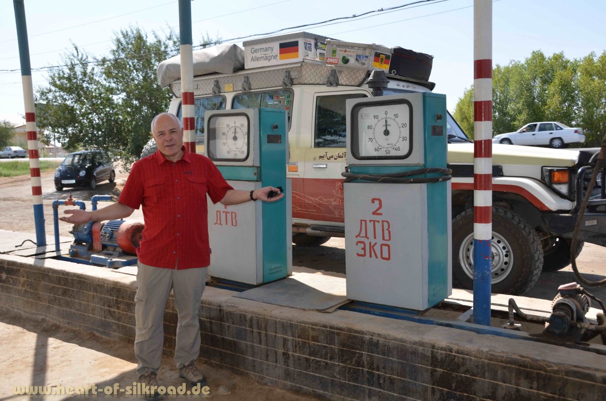Diesel gibt es, wenn überhaupt, nur für Firmenfahrzeuge gegen Rechnung. Wenn der Tank leer ist, bleibt einem nur die Möglichkeit, aus Turkmenistan geschmuggelten Diesel oder offiziellen usbekischen Diesel an den ganz wenigen Tankstellen teuer zu kaufen (ca. 1,10 €/Liter Diesel). Wir wussten um diese Situation und hatten unseren Zusatztank noch in Turkmenistan für 10 Cent/Liter vollgetankt. Mit den insgesamt 210 Litern können wir ungefähr 1500 Kilometer fahren.