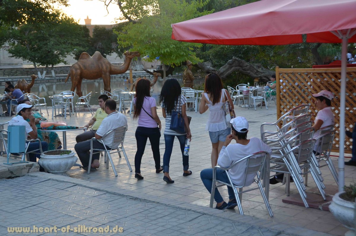 Von der Entwicklung in Buchara sind wir sehr enttäuscht. Der zentrale Platz, Labi Houz, mit den Medresen rund um einen Teich mit alten Maulbeerbäumen war ein Platz der Begegnung für die Einheimischen. Hier wurde auf den gemütlichen Sitzbänken, den sogenannten Taptshan, Tee getrunken und Domino gespielt. Die Altstadt rund um den Labi Houz musste vielen Hotelneubauten weichen und der Platz selbst ist zu einer Ansammlung touristischer Restaurants geworden. Aber der Knaller ist die Hüpfburg an der Ecke dieses historischen Platzes, übrigens Unesco Weltkulturerbe und die vielen Elektroautos für Kinder. Für die zunehmend usbekischen Touristen ist das sicher attraktiv, aber von dem Flair der alten Stadt an der Seidenstraße hat Buchara viel verloren.
