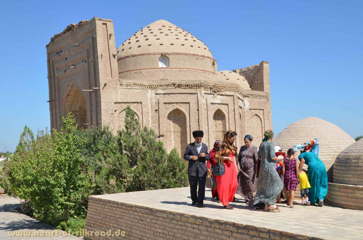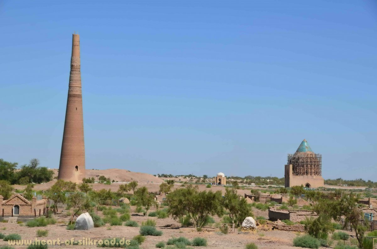 Auf der Nordseite der Karakum-Wüste erreichen wir die antike Stadt Konya Urgensch. Von Weitem ist das alte Minarett zu sehen, das ehemals den Karawanen als Leuchtturm diente. Leider ist von der alten Blütezeit nur noch ein großes Trümmerfeld übrig geblieben. Viele einheimische Pilger besuchen die berühmten Mausoleen und praktizieren dabei noch Rituale aus der vorislamischen Zeit. Vor der Einreise nach Usbekistan füllen wir auf dem sehr ursprünglichen Basar noch unsere Vorräte auf.