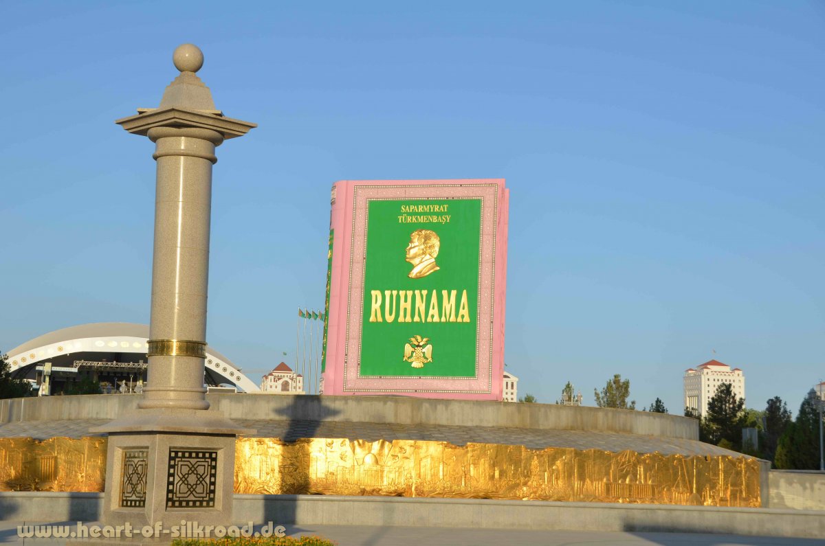 Nach dieser besonderen Einstimmung zur Begrüßung sind wir gespannt, ob sich das Land nach dem Tod des Alleinherrschers Turkmenbashi im Jahr 2006 verändert hat. Inzwischen ist sein ehemaliger Zahnarzt Gurbanguly Berdymukhamedov zum Präsidenten „gewählt“ worden. Und mit dem neuen Mann an der Spitze wurden auch die vielen Plakate des alten Präsidenten, mit denen man an jeder Stelle konfrontiert wurde, abgenommen. Der neue Präsident ist nur noch an öffentlichen Gebäuden abgebildet oder posiert wie in Zeiten des sozialistischen Realismus u. a. vor einem Mähdrescher. Die Geldscheine mit dem Konterfei des alten Präsidenten wurden nach seinem Tod aus dem Verkehr gezogen, so dass heute eigentlich nur noch die vielen vergoldeten Statuen und die gigantischen Bauten inklusive der Wasserfontänen an die Turkmenbashi-Ära erinnern. Geblieben ist allerdings die sogenannte Ruhnama, ein „koranähnliches“ Buch, in dem Turkmenbashi noch zu Lebzeiten seine teilweise sehr skurrilen Anweisungen für das Alltagsleben aller Turkmenen niedergeschrieben hat. Inzwischen findet man im Land eine absolut gleichgeschaltete Generation von jungen Erwachsenen, die mit diesem Buch aufgewachsen sind, alle Ferse auswendig lernen mussten und täglich danach zu leben haben. Uns fallen bei dieser Gelegenheit mindestens zwei Diktatoren ein, die Ähnliches - zum Glück nur kurzzeitig - praktiziert haben.