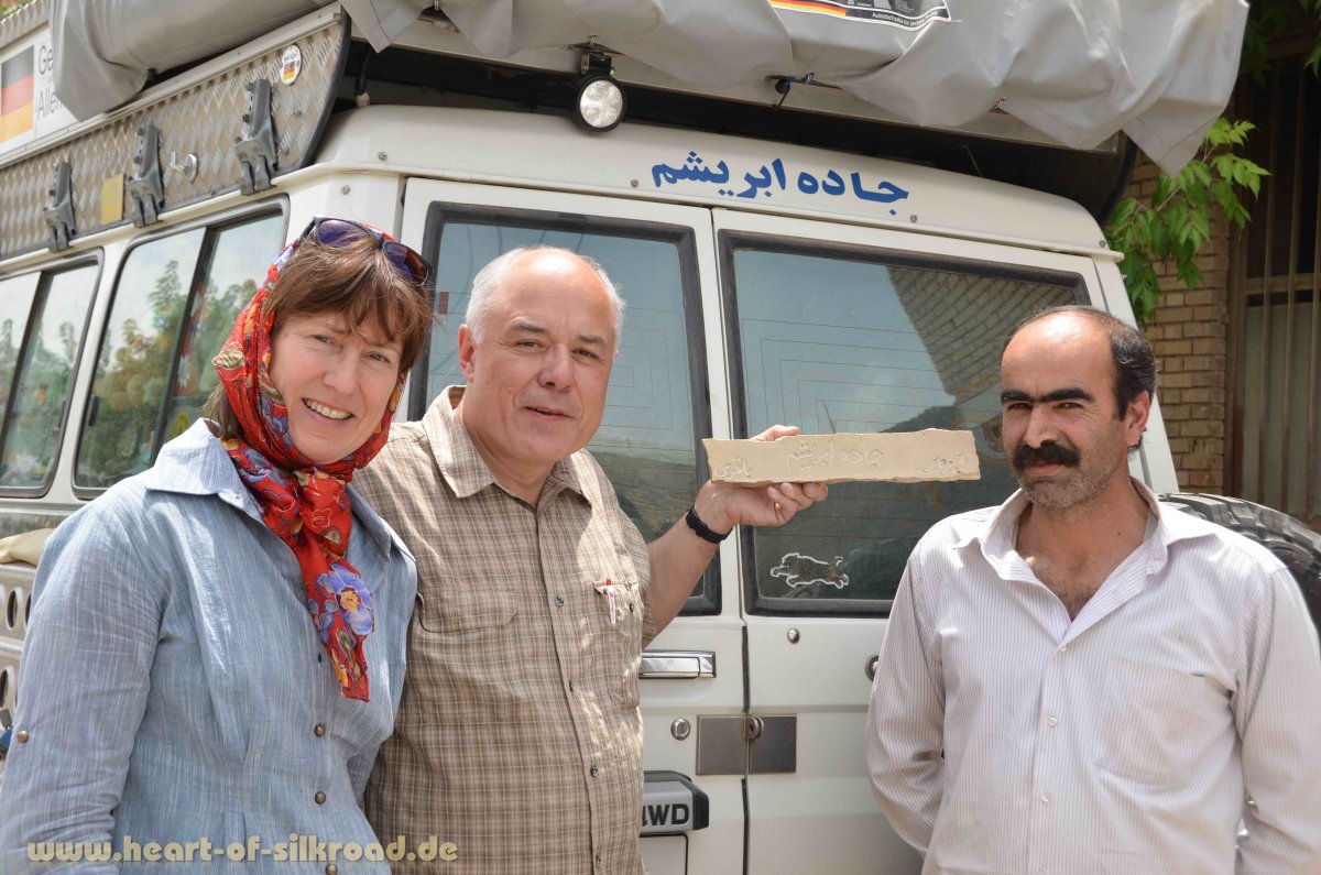 Entlang des Zayanderud wird intensiv Landwirtschaft betrieben und die Kirschen, Pfirsiche und Melonen schmecken um diese Jahreszeit natürlich köstlich. In dem Dorf Hafshejan treffen wir dann noch auf einen Steinmetz, der uns ein ganz besonderes Geschenk anfertigt. Auf einem Stein graviert er den Schriftzug „Seidenstraße“ in persischer Sprache und überreicht uns dieses Stück ganz stolz.