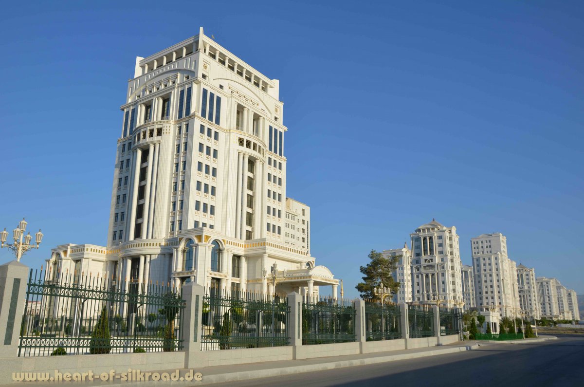 Die Hauptstadt Ashgabat ist in den letzten Jahren extrem gewachsen, wobei die neuen weißen Häuser sehr steril auf uns wirken. Wir sind uns nicht sicher, ob in diesen riesigen Wohnblocks wirklich Leute wohnen, denn alles sieht in dem neuen Stadtteil sehr menschenleer aus. Auf den Straßen sind einzig die Leute, die die Stadt sauber halten und dafür sorgen, dass die unzähligen Wasserfontänen funktionieren. Nicht zu vergessen die Polizei, die an jeder Ecke steht und alles bewacht. Diesem Staat entgeht nichts, was den Vorteil hat, dass wir uns um unsere Sicherheit keine Gedanken machen müssen.