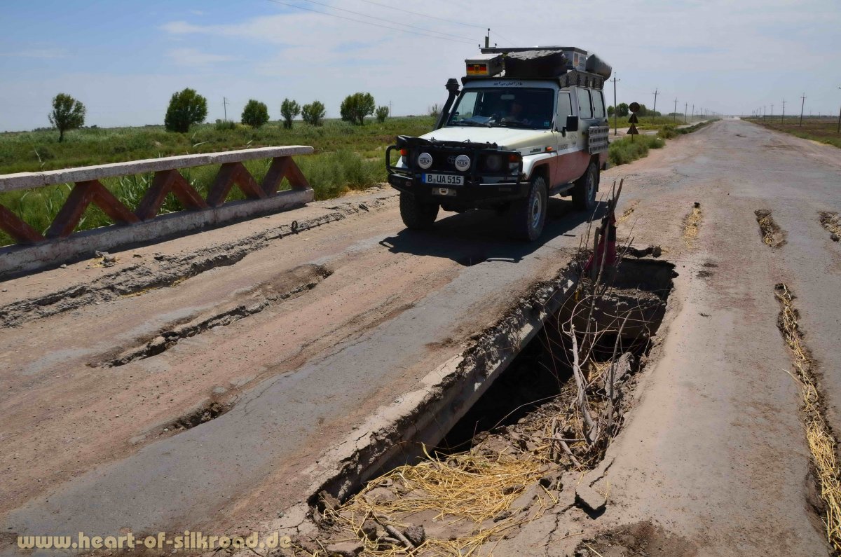 Auf den Hauptrouten werden einige neue Straßen gebaut, die sich aber schon kurz nach der Fertigstellung wieder „auflösen“. Wie man sehr gute und haltbare Straßen in Wüstenlandschaften baut, könnten sich die Turkmenen in Usbekistan oder im Iran mal anschauen.