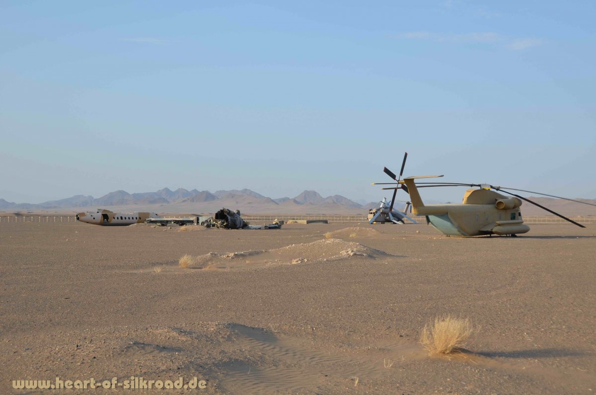 Nur 32 Kilometer nördlich von der Stadt Robat-e-Posht Badam stoßen wir auf ein Areal, das an die gescheiterte Befreiung der US-Botschaftsgeiseln in Teheran von 1979 erinnert. Diese Aktion war damals von den US-Militärs für zwei Tage geplant und scheiterte hier in der Dasht-e-Kavir schon in der ersten Nacht aufgrund eines Sandsturms, als einer der Helikopter mit einem der Hercules-Flugzeuge kollidierte.