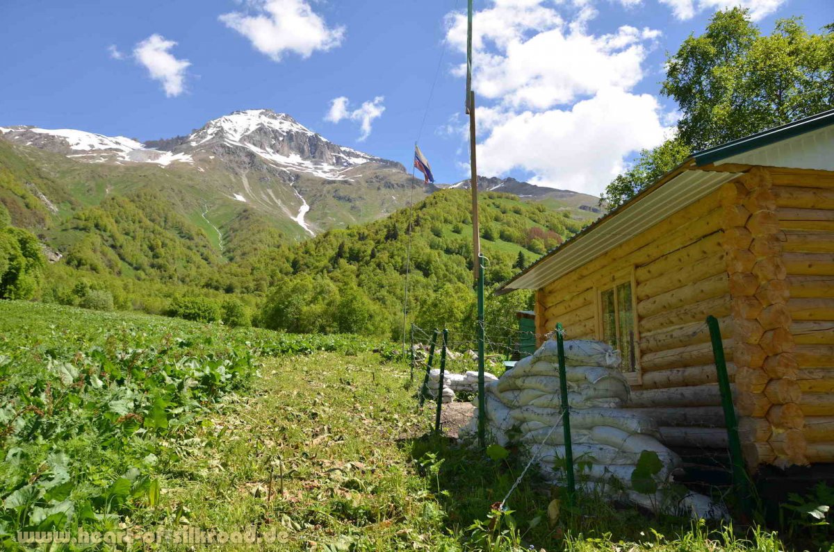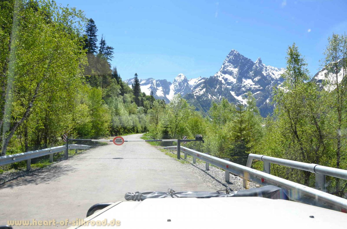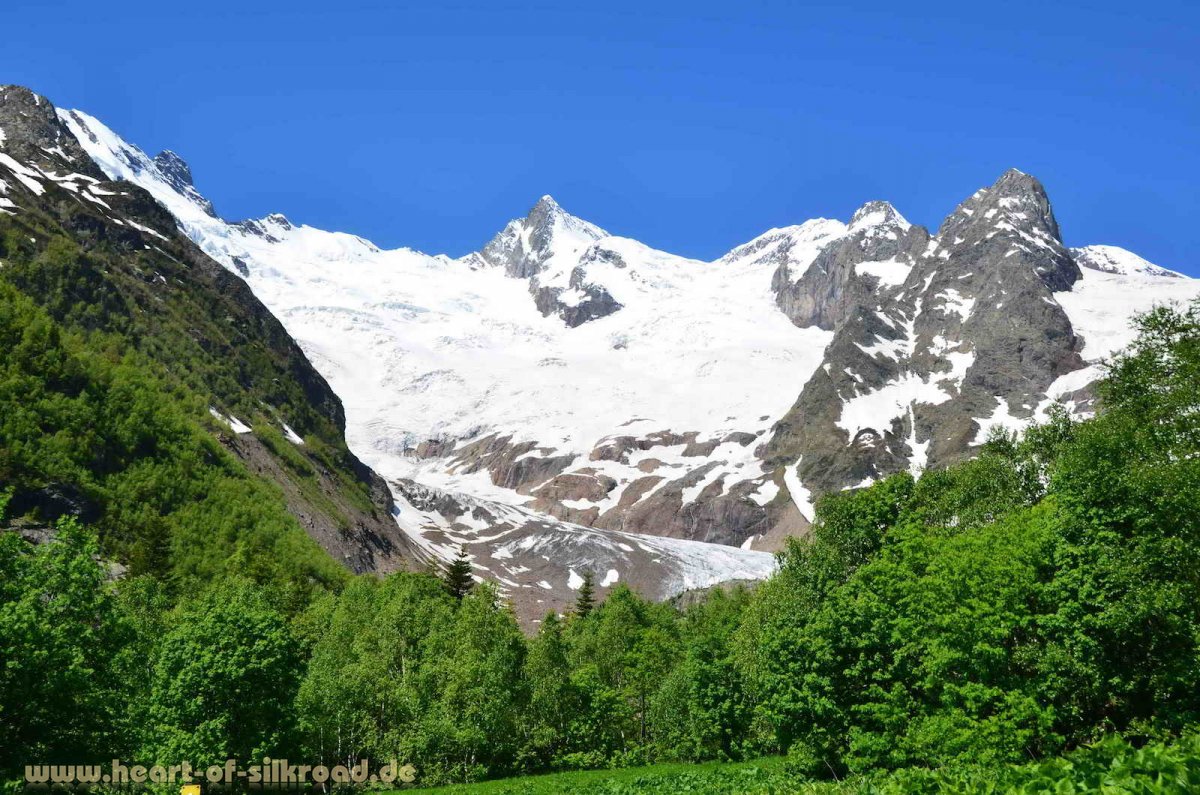 Als erstes Ziel erreichen wir Dombay, ein kleiner Ort für Wintersportler und Bergsteiger im russischen Westkaukasus. Leider liegt Dombay sehr dicht an der Grenze zu Abchasien, eine Region, die 2008 im russisch-georgischen Krieg von den Russen besetzt wurde. Diese Grenze ist bis heute nicht von Georgien akzeptiert worden und so stoßen wir sehr häufig auf Soldaten, die uns nicht weiter passieren lassen. Wanderungen enden oft am Checkpoint und ohne Sondergenehmigung kommt man hier nicht weiter.