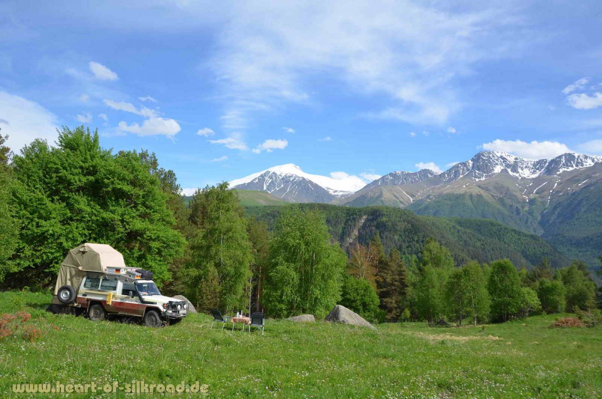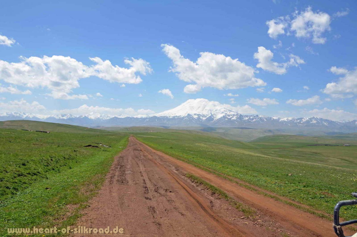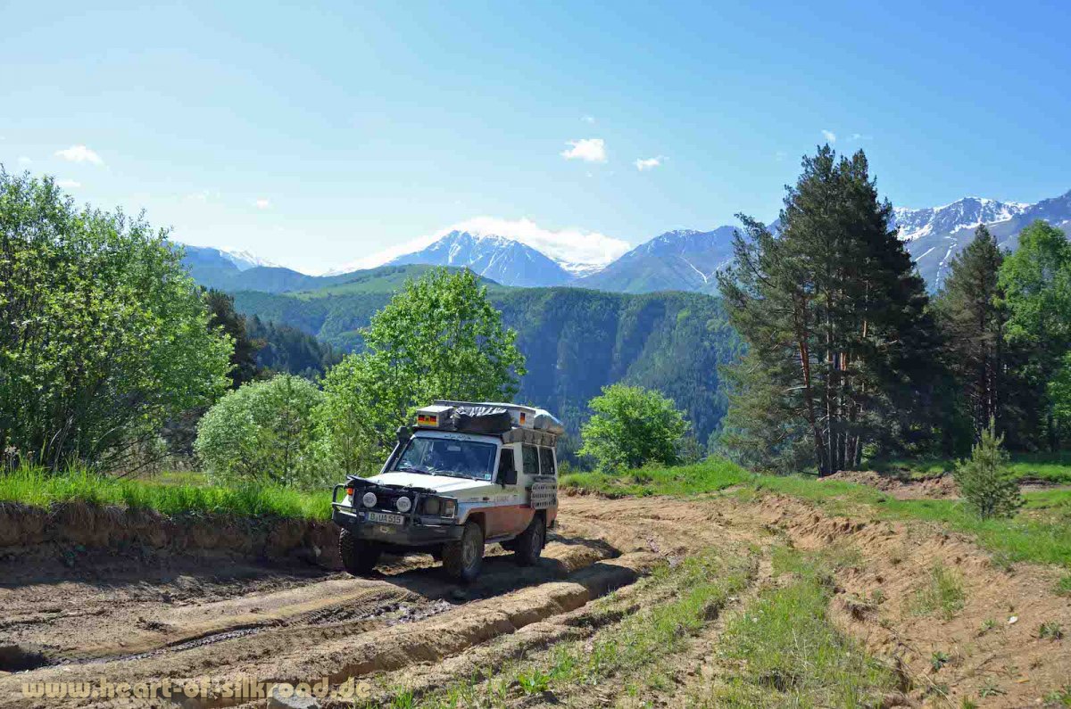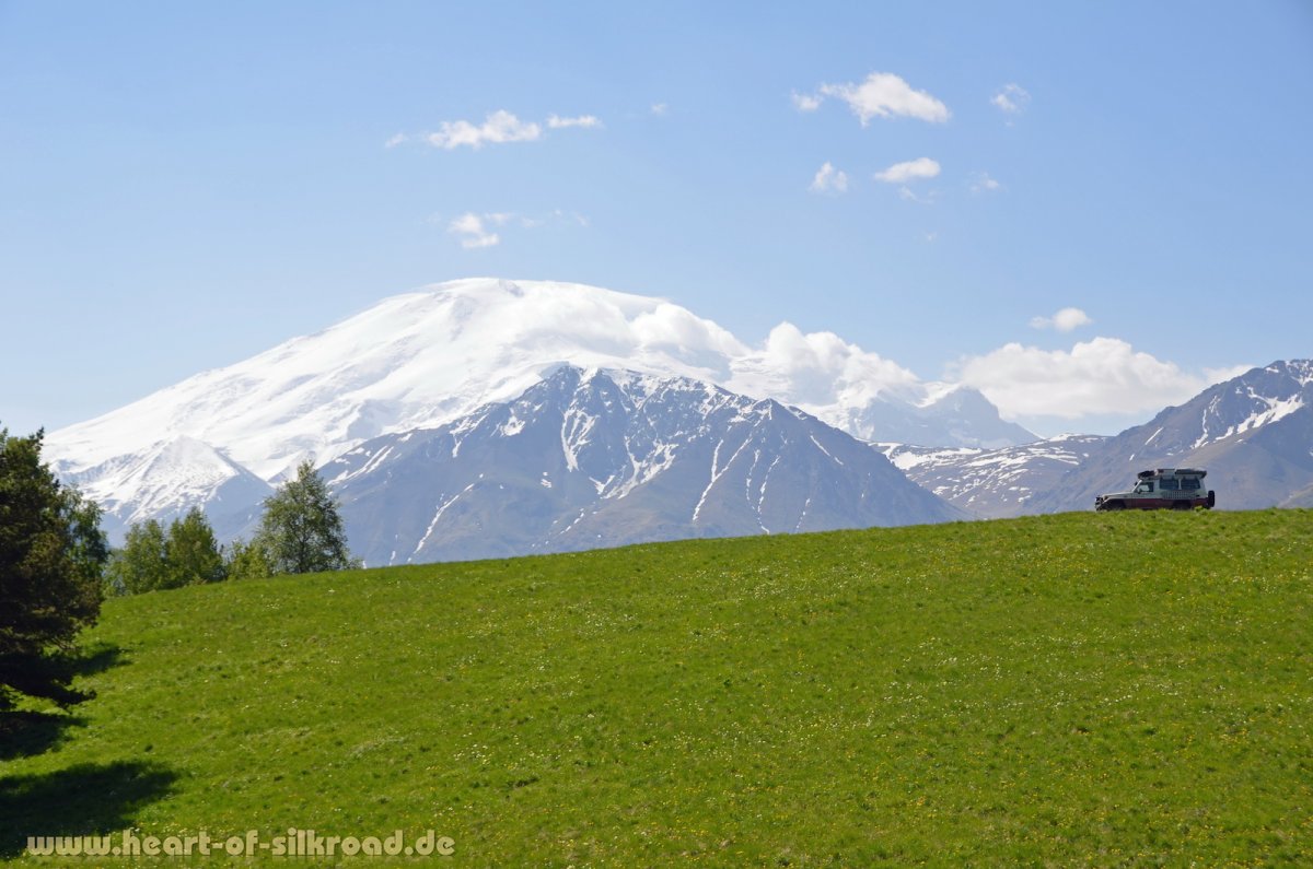 Unsere nächste Station ist die Nordseite des Elbrus Nationalparks, den wir über eine 70 Kilometer lange Schotter- und Sandpiste erreichen. Für uns ist diese Route entlang eines Bergrückens auf ca. 2300 Meter sicher eine der schönsten, die wir jemals gefahren sind. Zwei Tage lang haben wir einen ständigen Blick auf die schneebedeckten Berge des Kaukasushauptkamms mit dem höchsten Berg Europas – dem Elbrus (5642 Meter). Außer einigen Hirten mit ihren Tieren treffen wir keinen Menschen und andere Fahrzeuge schon gar nicht.