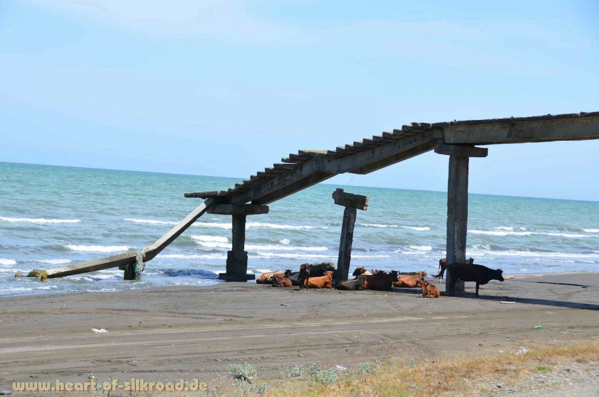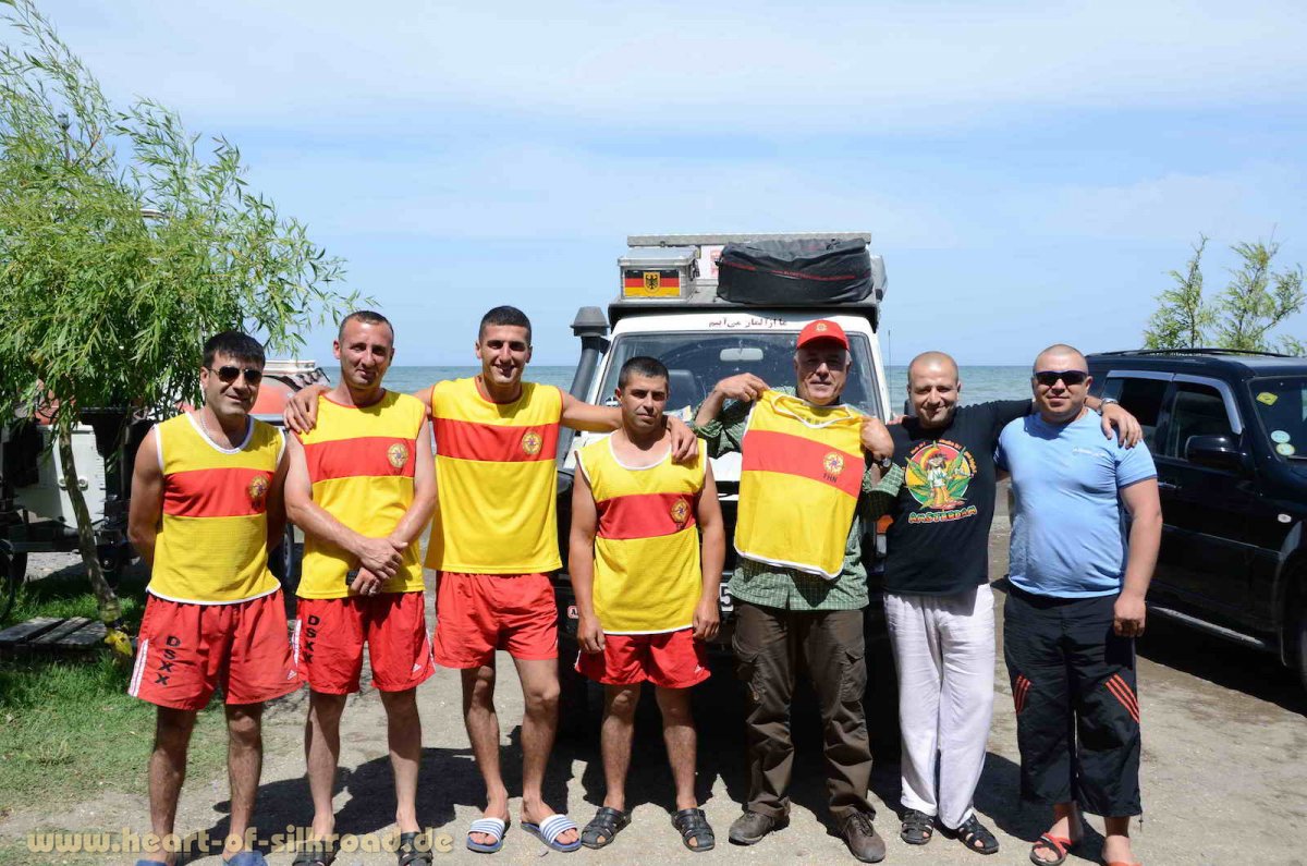 Nach der anstrengenden Etappe durch den russischen Kaukasus und dem Grenzübertritt nach Aserbaidschan wollen wir am Kaspischen Meer erst einmal Kräfte sammeln. Auf den erhofften Badespaß müssen wir leider verzichten, weil die Strände verdreckt und durch den ständig steigenden Wasserspiegel immer schmaler geworden sind. Viele Häuser und Strandanlagen sind bereits im Meer verschwunden, wofür Wissenschaftler den Grund in tektonischen Verschiebungen am Meeresgrund sehen. Trotzdem sind hier die staatlichen Rettungsschwimmer anwesend. Für Andreas ist als ehrenamtlicher Rettungsschwimmer und Taucher der DLRG Berlin ein Besuch der örtlichen Wasserrettungsstation natürlich Ehrensache.