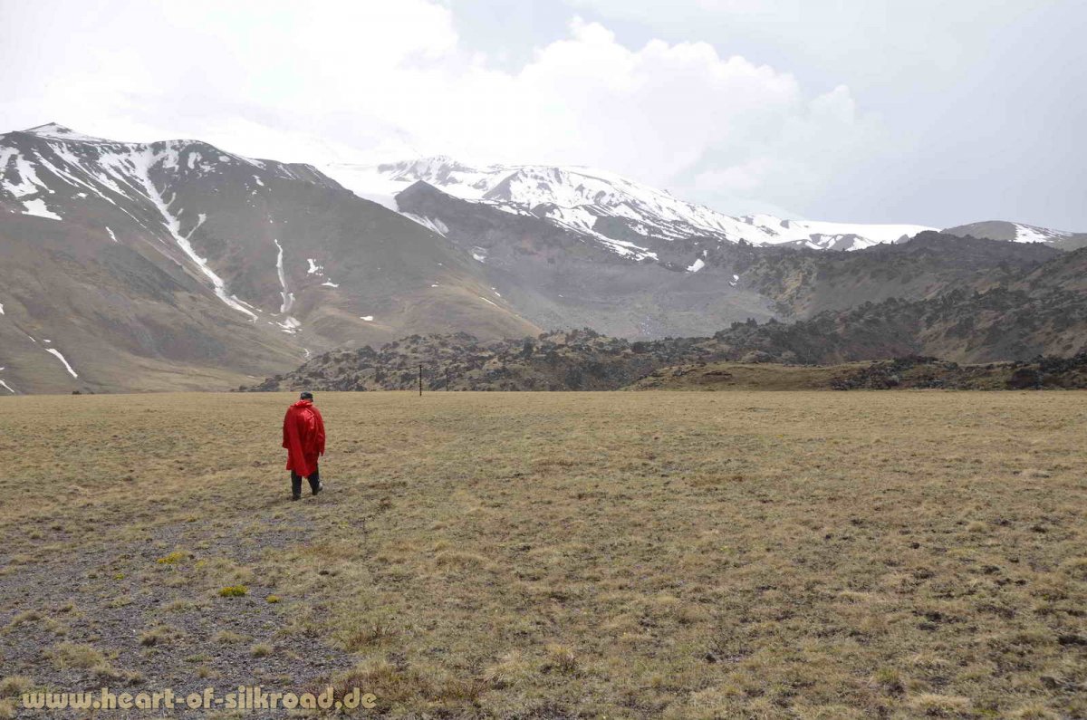 Auch wenn es uns schwerfällt diesen schönen Fleck Erde zu verlassen, so wollen wir doch weiter zum Elbrus Basislager fahren, um von dort aus in den Bergen zu wandern. Das Basislager ist nicht sehr einladend, obwohl es hier eine heiße Thermalquelle und mehrere spektakuläre Wasserfälle gibt. Wir beschließen zum Basislager I aufzubrechen, das man noch mit einem Geländewagen erreichen kann. Von hier aus gehen wir dann mit Tagesgepäck weiter Richtung Basislager II. Im 2. Weltkrieg war die Region am Elbrus heiß umkämpft. Das militärische Flugfeld in 2900 Meter Höhe ist heute noch deutlich zu erkennen und es wehte im September 1942 sogar die Flagge von Nazi-Deutschland auf dem Elbrus. Wir hatten von einer unglaublichen Geschichte gehört, der wir leider auch vor Ort nicht weiter nachgehen können. Auf dieses Flugfeld soll von den Nazis eine Gruppe von Lamas aus Tibet einflogen worden sein, damit sie am „Zukunftsberg“ Kalizkayj- in 3781 Meter Höhe den Ausgang des zweiten Weltkrieges vorhersagen sollten. Sie prognostizierten die Niederlage Deutschlands und sollen auf der Stelle erschossen worden sein.