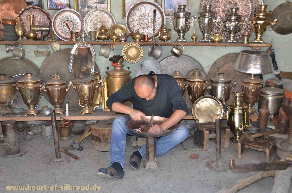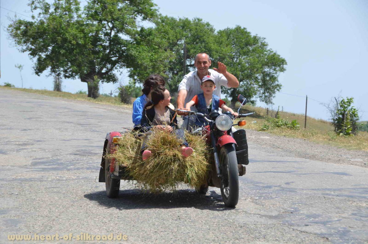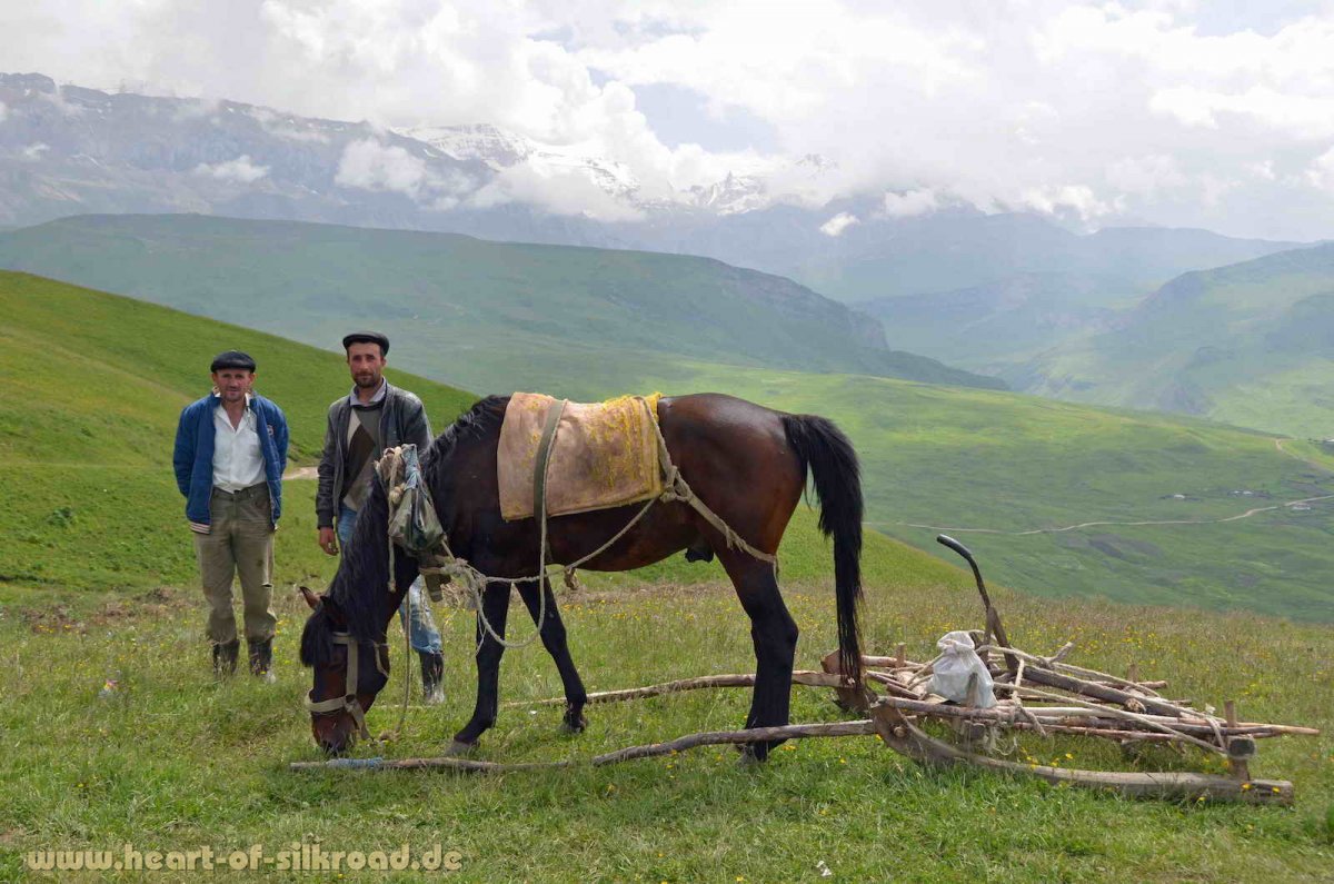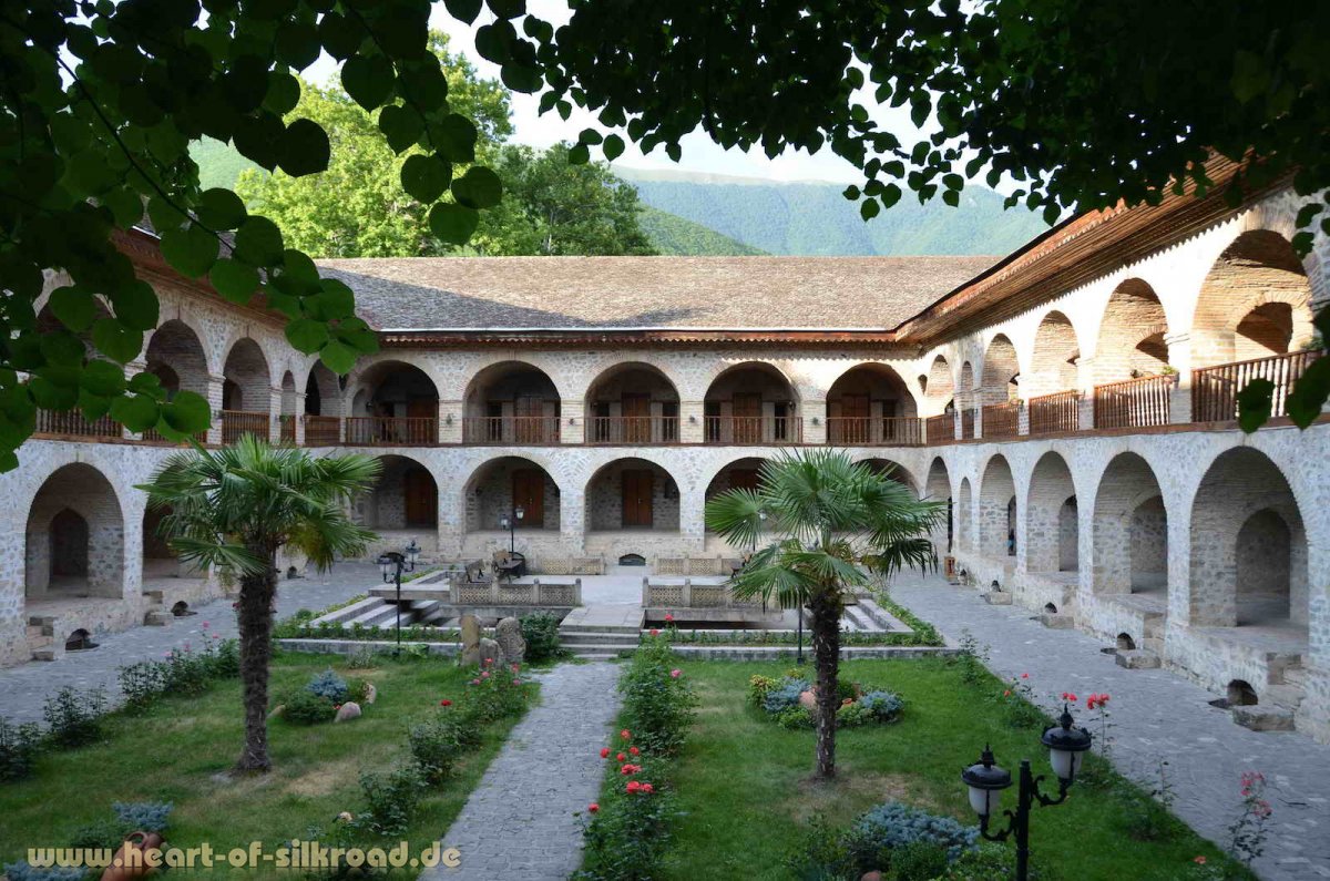 Von Baku aus fahren wir nochmals in die Berge - in den südlichen Kaukasus, den wir bei unseren drei Durchquerungsversuchen leider nie auf den direkten Weg erreicht haben. Historische Orte der Seidenstraße, archäologische Ausgrabungsstätten und Karawansereien sind dort noch heute zu finden. Unser erstes Ziel ist das persisch geprägte Bergdorf Lahic, das wegen des Kupferhandwerks bis nach China bekannt wurde. Zu Hochzeiten der Seidenstraße im 11.-13. Jh. arbeiteten dort 200 Kupferschmiede, von denen es heute aber nur noch wenige gibt. Weiter fahren wir auf einer gut ausgebauten Straße Richtung Nordwesten und erreichen Gabala, wo gerade die sechstausend Jahre alten Ruinen einer großen Handelsstadt durch Archäologen freigelegt werden. Der Ausgrabungsleiter führt uns persönlich auf dem riesigen Areal herum und wird nicht müde unsere Fragen zu beantworten. Die vielen Skelette weisen mit ihrer Ausrichtung zur Sonne darauf hin, dass auch hier schon Zoroastrier gelebt haben. Eine Stadt mit einer riesigen, mehrmals verstärkten Stadtmauer und einem hocheffektiven Trink- und Abwassersystem sind zu erkennen. Unsere letzte Station an der ehemaligen Seidenstraße in Aserbaidschan ist die Stadt Shäki, wo einst Seide produziert wurde, nachdem das Geheimnis der Herstellung dieses edlen Stoffes aus China bekannt geworden war. Wir übernachten hier in einer zum Hotel umgebauten Karawanserei.