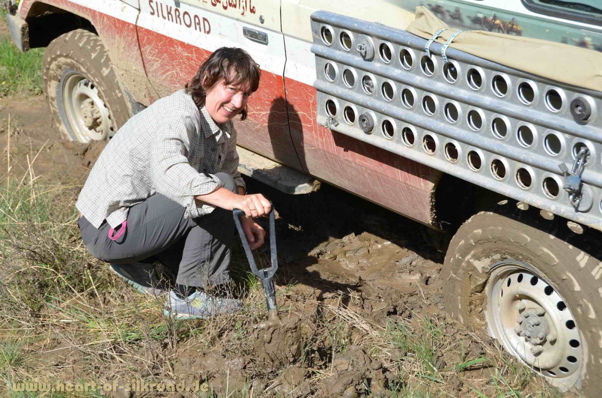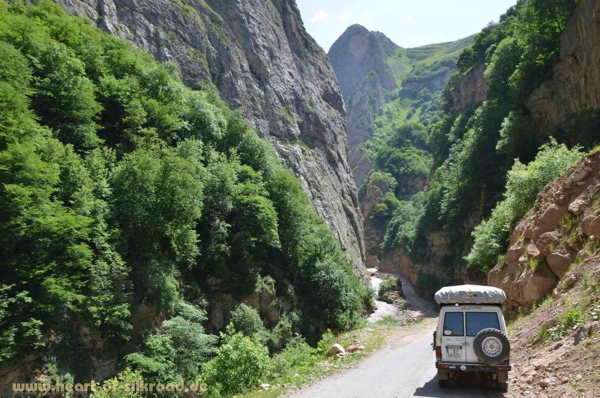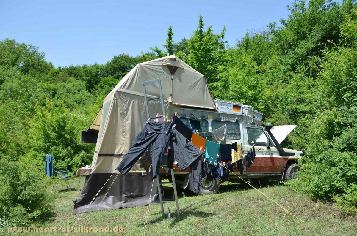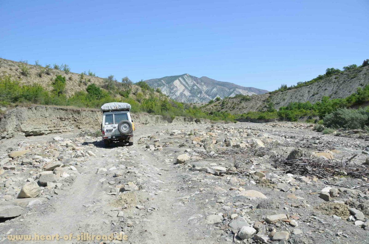 Nachdem uns die Durchquerung des Kaukasus über die Herrstraße wegen des Erdrutsches verwehrt war, wollen wir in Aserbaidschan einen weiteren Versuch starten, den Kaukasus von Nord nach Süd zu überqueren. Doch je höher wir fahren, umso schwieriger und steiler werden die Pisten hinauf zu den Bergpässen. Auch die ausgetrockneten Flusstäler erweisen sich als unpassierbar. Wir unternehmen drei Versuche aber eine Durchquerung ist nicht möglich. Zudem haben wir Probleme mit unserer Kupplung und der Motor wird beim Fahren in der Geländeuntersetzung immer heißer, was zur Folge hat, dass die Klimaanlage ausfällt – und das bei einer Außentemperatur von 36 Grad. Wir wollen ja mit diesem Auto noch bis nach Thailand kommen und entschließen uns frühzeitig zur Umkehr. Unser nächstes Ziel ist das 5000 Jahre alte Bergdorf Xinaling, das wir über eine asphaltierte Straße erreichen. Was für eine Wohltat, ohne das tagelange Gerüttel auf den ausgefahrenen Jeeptracks. Wieder im Tal angekommen, finden wir ein schönes Plätzchen für ein Camp am Fluss, das wir nutzen, um endlich mal unsere Wäsche zu waschen.