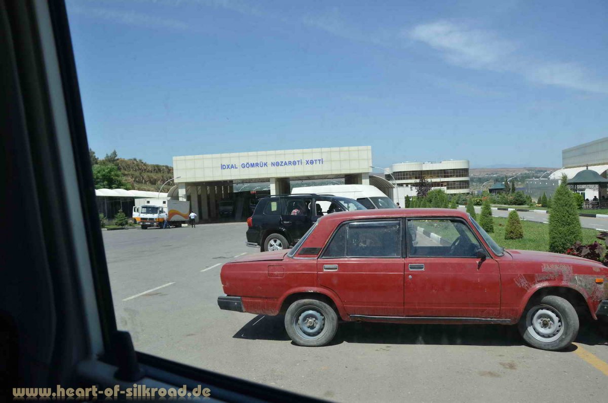 Spannend bleibt jetzt der nächste Schritt, nämlich die Einreise nach Aserbaidschan ohne gültiges Visum. Wird man uns zurückschicken oder müssen wir im Niemandsland campieren. Auf der aserbaidschanischen Seite stehen wir erst einmal bis 2:00 Uhr morgens bevor überhaupt etwas passiert. Auch hier müssen die Leute wieder die Autos komplett ausräumen und alle Taschen in einer Halle scannen lassen. Was blüht uns wohl? Aber diesmal haben wir Glück. Das Auto wird nicht weiter kontrolliert. Um 3:30 Uhr kommt Andras endlich zurück. Er hat schon die Autoversicherung (50 USD) und die Straßenbenutzungssteuer (40 USD) bezahlt. Was das Visum angeht, gibt es allerdings Probleme, die von den Grenzbeamten der Frühschicht gelöst werden sollen. Und so verbringen wir den Rest der Nacht im Niemandsland. Wieder ein Notcamp! Am nächsten Morgen ist die Frühschicht mit der Entscheidung der Nachtschicht gar nicht zufrieden und stellt uns vor die Wahl, ohne Visum wieder nach Russland zurück zu fahren oder sechs Tage – also bis zum 11. Juni - auf dem Parkplatz im Niemandsland zu bleiben. Wir entscheiden uns für Letzteres und gehen zu unserem „Grenzcamp“ zurück. Als wir dann die Campinghocker und den Tisch vor unser Auto stellen, Tee kochen und erst einmal frühstücken, wird den Beamten die Sache doch zu mulmig und nach weiteren zwei Stunden fällt der Chef der Grenzpolizei die Entscheidung, uns vorzeitig nach Aserbaidschan einreisen zu lassen. So sind sie das Problem mit den beiden Deutschen wenigsten los.