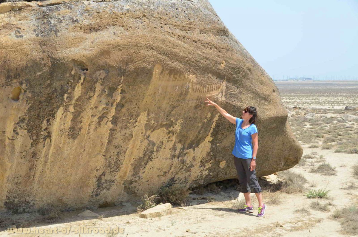 In Aserbaidschan gibt es aber noch eine weitere interessante Geschichte, der wir nachgehen wollen. Die Wikinger hatten 944 n. Chr. das Land für zwei Monate besetzt. Sie kamen über die Wolga, das Kaspische Meer und fuhren mit ihren Schiffen den Kür-Fluss bis ins Landesinnere hoch, um dann die damalige Hauptstadt Bärdä zu erobern. So war Aserbaidschan für zwei Monate eine Kolonie der Wikinger bis die Perser sie wieder vertrieben. Aber die Verbindung zwischen Nordeuropa und Aserbaidschan liegt noch viel weiter in der Geschichte zurück, denn in der Mythologie der Wikinger gibt es den Gott Odin, der aus Azer – und Azer nennen sich heute die Aserbaidschaner - stammt. Im Jahr 1939 fand man in der Region Gobustan am Kaspischen Meer 8000 Jahre alte Petroglyphen von Langboten, wie sie von den Wikingern verwendet wurden. Für den norwegischen Forscher Thor Heyerdahl war das ein Beweis für seine These, dass es eine Jahrtausend alte Verbindung zwischen Aserbaidschan und Norwegen gibt und der Ursprung der Wikinger wahrscheinlich in Aserbaidschan liegt. Dass die Wikinger von Russland aus einen intensiven Handel mit Mesopotamien betrieben haben, konnten wir bereits 2010 bei der Besichtigung in der Wikingerburg am Ladogasee, nördlich von St. Petersburg, sehen.