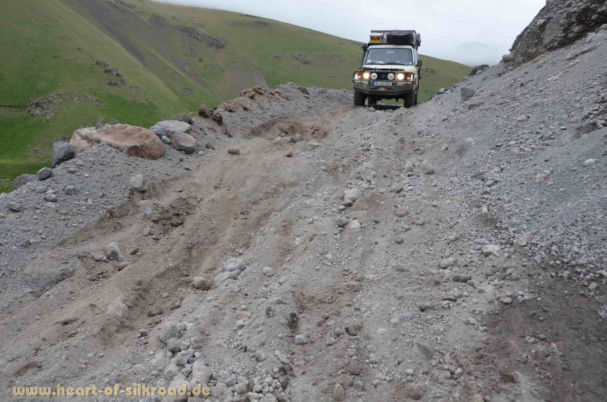 Die nächsten Tage schmeißen unsere Reisepläne erst einmal über den Haufen. Von Russland aus soll unsere Tour über Georgien nach Aserbaidschan und weiter in den Iran gehen. Wir wollen über den seit 2012 für ausländische Touristen geöffneten Militärhighway am Kreuzpass den Kaukasus von Russland nach Georgien überqueren. Unser russisches Visum ist leider etwas zu knapp bemessen und wir haben für unsere Ausreise nur noch zwei Tage Zeit. Es ist purer Zufall, als wir aus den Bergen zurück in die „online-Zivilisation“ kommen und per E-Mail von unseren Buschtaxi-Freunden Sabine und Bernd erfahren, dass die Grenze zwischen Russland und Georgien wegen eines Erdrutsches am Kazbegi geschlossen ist.