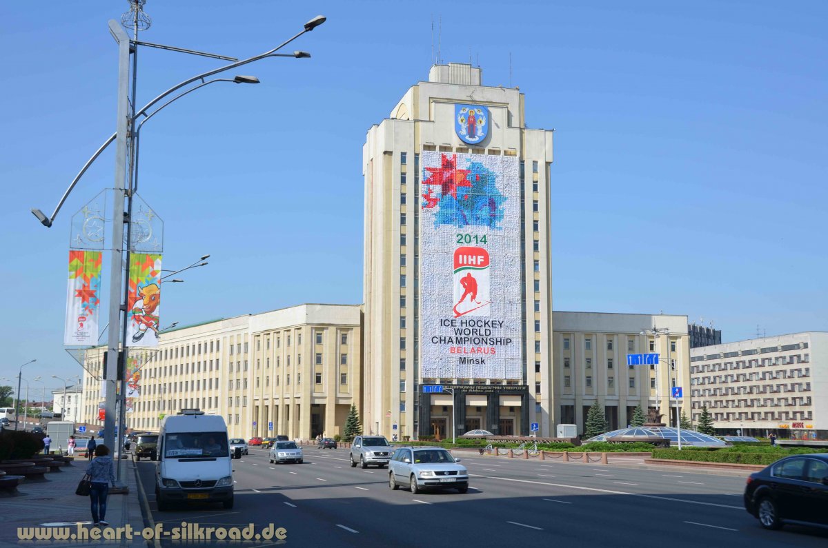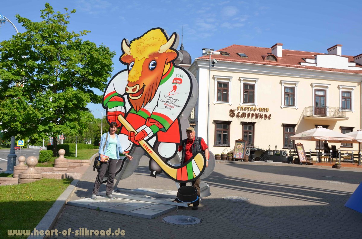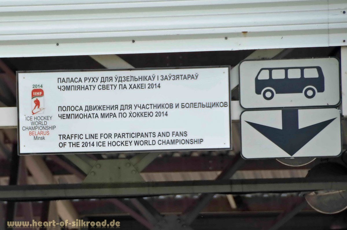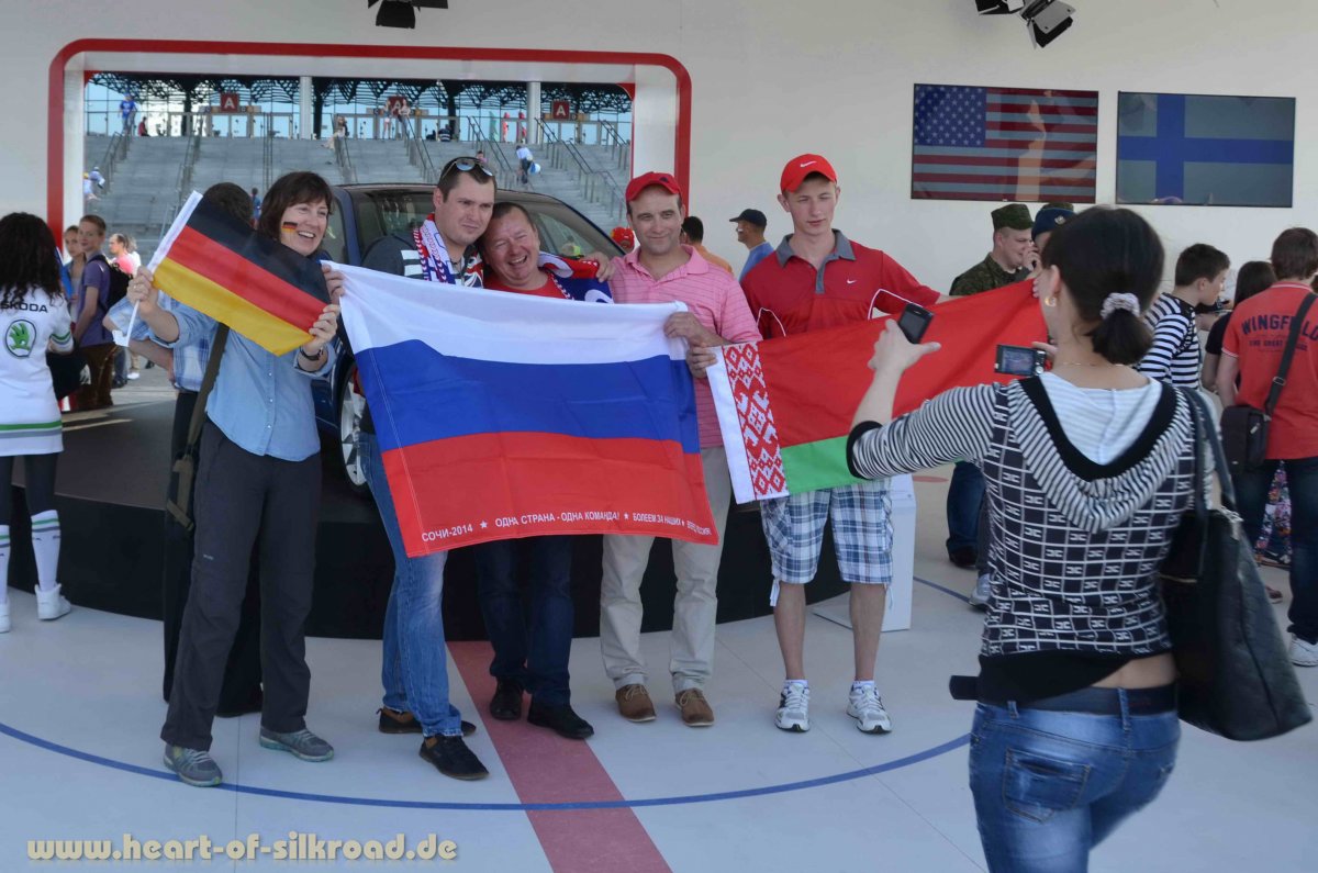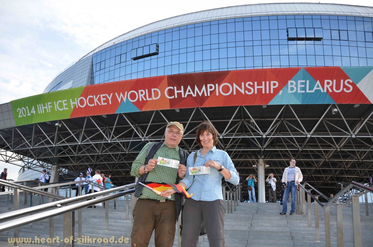 Wir wollen die Eishockey-Tickets aber nicht nur nutzen, um einfach durch Weißrussland reisen zu können, sondern das Spiel Deutschland-Russland auch live erleben und quartieren uns im Hotel Sputnik ein. Mit dem Stadtbus fahren wir dann zum riesigen Fan-Areal der Weltmeisterschaft, wo die Stimmung schon lange vor dem Spiel grandios ist. In dem ausverkauften Stadion sind unter Russen und Weißrussen nur eine Handvoll deutscher Fans. Auch wenn wir nicht wirkliche Eishockey-Kenner sind, so haben wir doch sehr viel Spaß in unserem sicher billigsten Block D unter harten Russen-Eishockey-Fans.