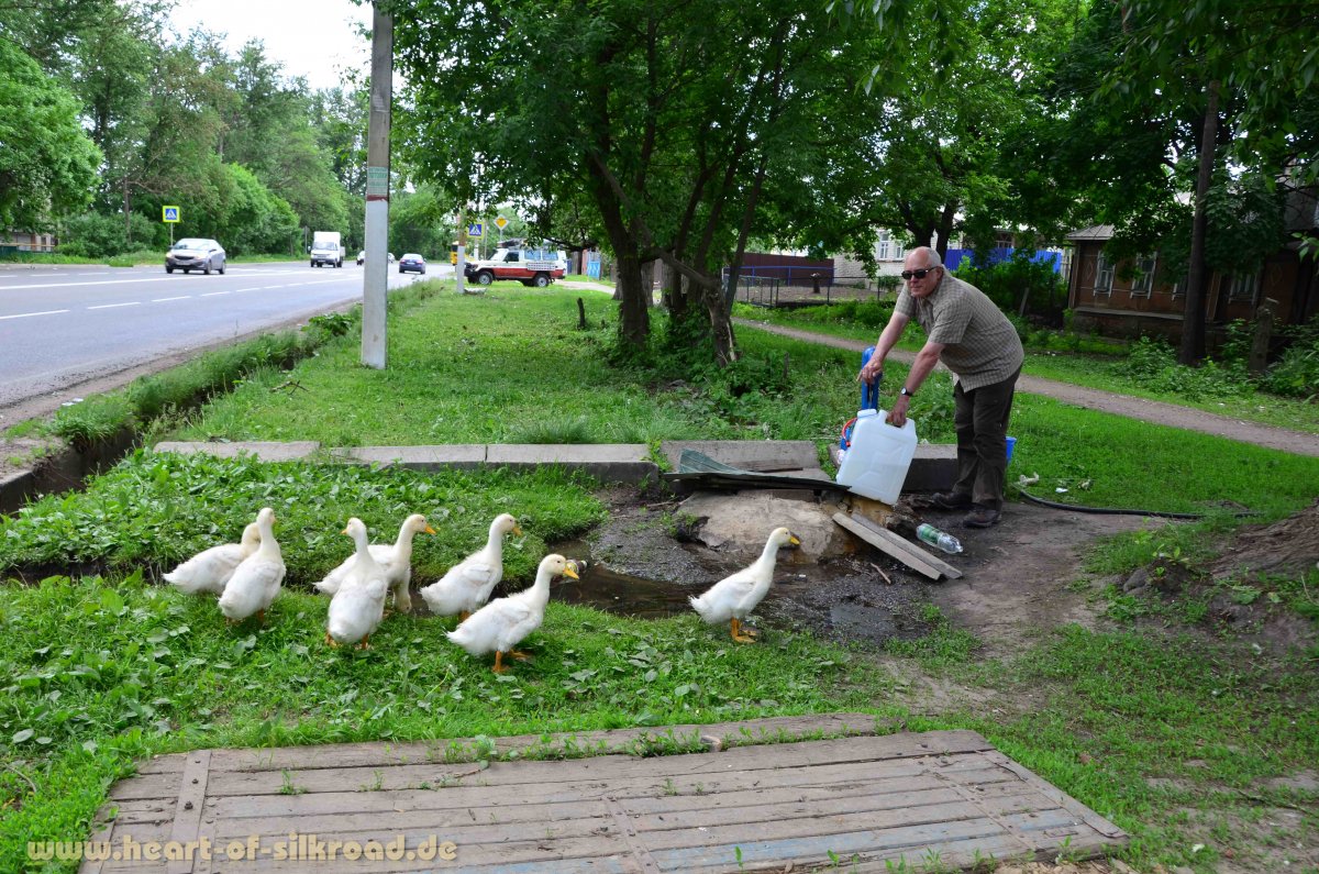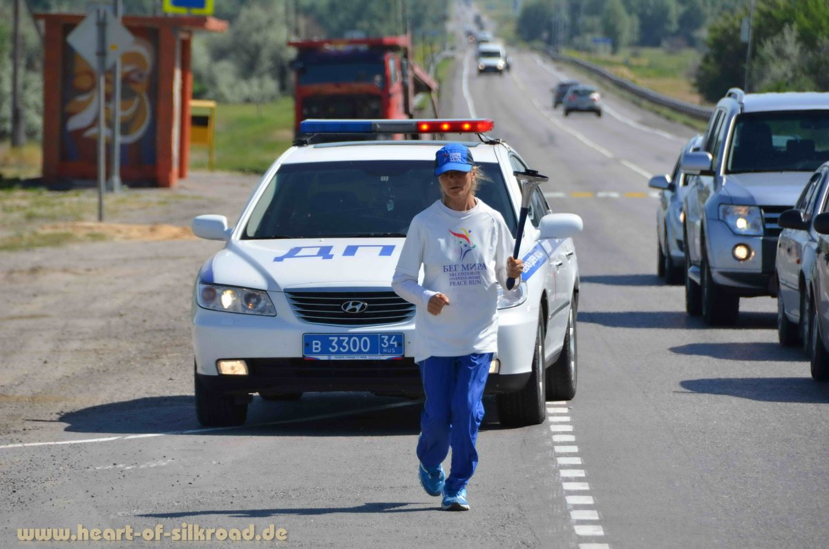Kurz vor Wolgograd kommt uns dann eine Läuferin mit brennender Fackel auf der Magistralen M6 entgegen. Sie gehört zu einem Team von Läufern, die an einem internationalen Friedenslauf teilnehmen. Alle 5 km wird die Fackel an ein Teammitglied übergeben. Diese Gruppe von 6 Läufern ist in Südrussland gestartet und will am 8. August in Tomsk (Sibirien) sein. Wie symbolisch, dass wir die Gruppe gerade hier treffen, wo 1942 der grausame Krieg um Stalingrad wütete. Stalingrad war 2012 schon einmal Ziel unserer Reise und wir möchten an diesen Stelle auf unseren Reisebericht „Unterwegs ins Wolgadelta und in die Kalmückische Steppe“ verweisen.