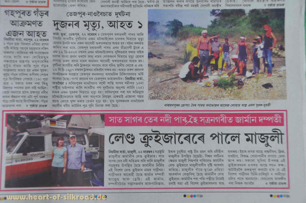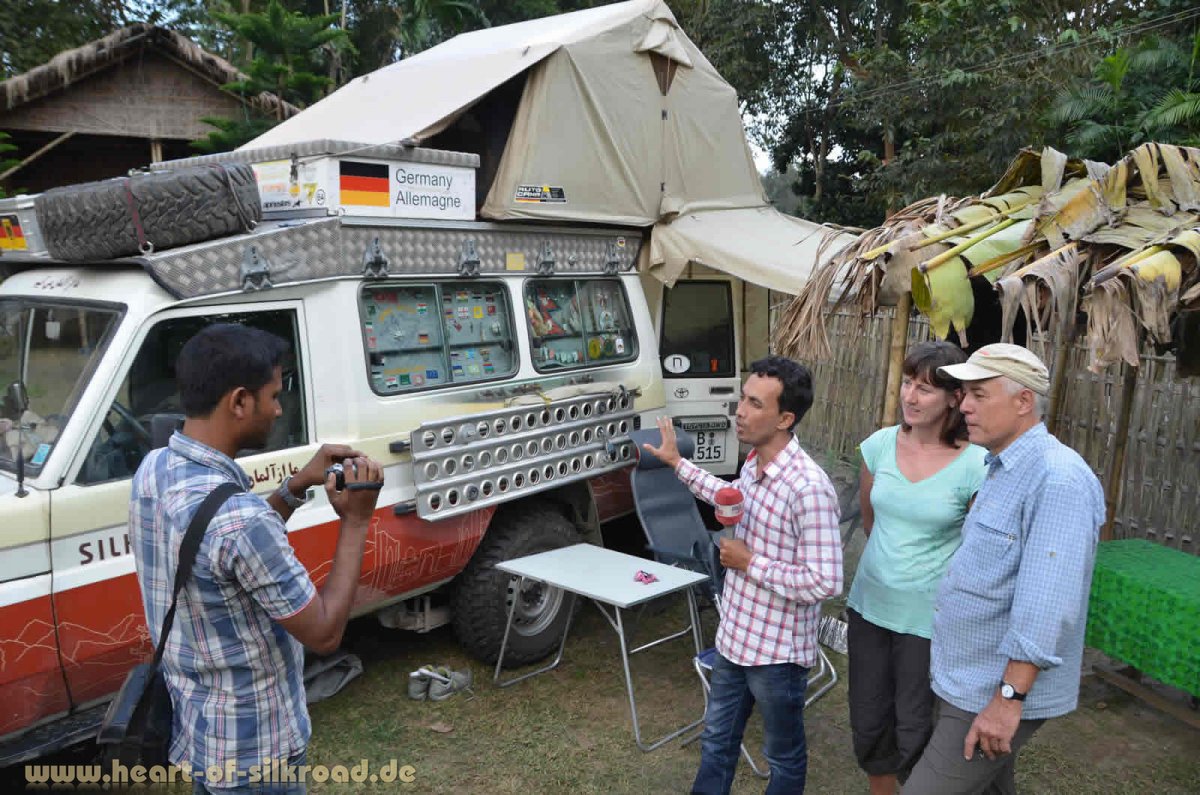 Mit unserem Camp, das wir wieder einmal im Garten einer kleinen Bambus-Lodge aufstellen dürfen, bleiben wir nicht lange unentdeckt. Drei Journalistenteams aus Assam sind an uns interessiert und stehen am nächsten Tag vor unserem Auto. Für drei Fernsehsender und eine Zeitung geben wir Interviews zu unserer Reise und als wir einige Tage später die Insel verlassen, scheinen uns alle Einwohner zu kennen.