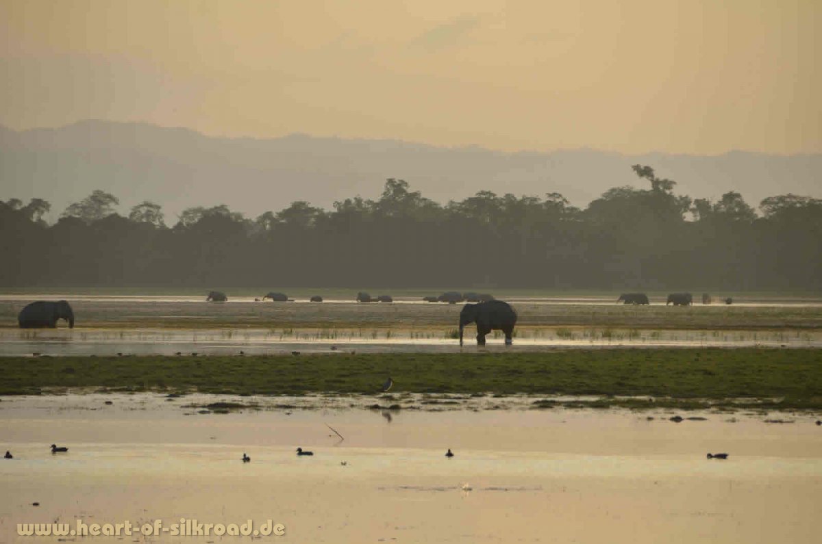 Hatten wir im Manas Nationalpark nicht so viel Glück, große Tiere zu sehen, so werden wir im Kaziranga Nationalpark am Ufer des Brahmaputra-Flusses mit 2200 Nasshörnern, 2000 wilden Elefanten, 106 Tigern, wilden Büffeln, Barasinghirschen, Gibbons und unzähligen Vögeln absolut entschädigt. Vier Tage campen wir im Garten einer sehr schönen Lodge und genießen die Ausflüge in den Park auf dem Rücken eines Elefanten, zu Fuß und per Geländewagen.