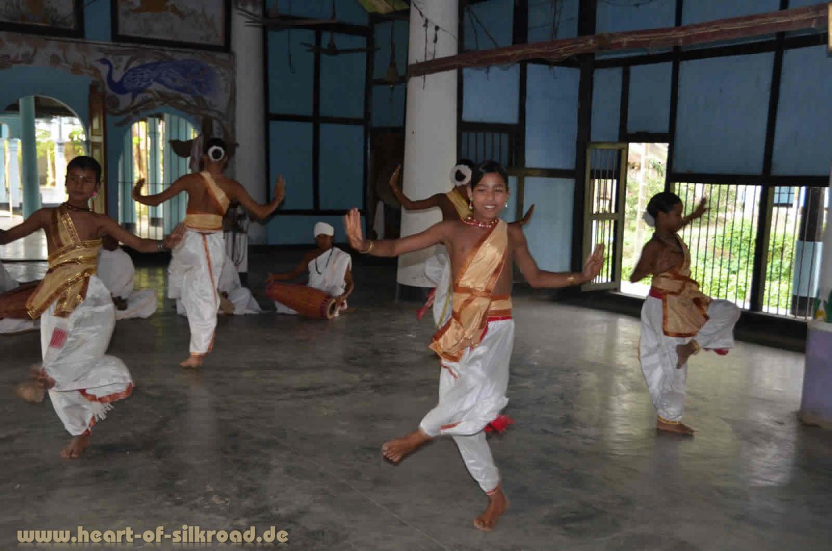 Ein weiteres Highlight auf Majuli sind die Satras. Ein Satra ist ein hinduistisches Kloster, in dem Mönche leben, die sich der Lehre von Vishnu verschrieben haben. Satras sind sehr spirituell geprägt und ein Komplex aus Tempel, Kloster, Gebetshaus und Ghats für rituelle Bäder. Außerdem werden Kunstformen wie Lyrik, Musik, Literatur, Bildhauerei und Tanz gelehrt. Eltern geben ihre Kinder im Alter von vier Jahren aus religiösen, oft aber auch aus finanziellen Gründen in ein Satra. Die Kinder und Jugendlichen gehen auch als Mönche in eine normale Schule, wohnen und arbeiten aber im Kloster. In Kamalabari besuchen wir ein Satra aus dem 17. Jahrhundert, wo die Mönche klassische Tempeltänze erlernen. Die Darbietung erinnert uns aber eher an akrobatische Zirkusübungen. Wir sind an diesem Satra interessiert, weil hier ein Filmteam von Arte-TV eine Reportage über einen vierjährigen Jungen gedreht hat, der als kleiner Mönch in das Kloster aufgenommen wurde und mittlerweile acht Jahre alt ist.