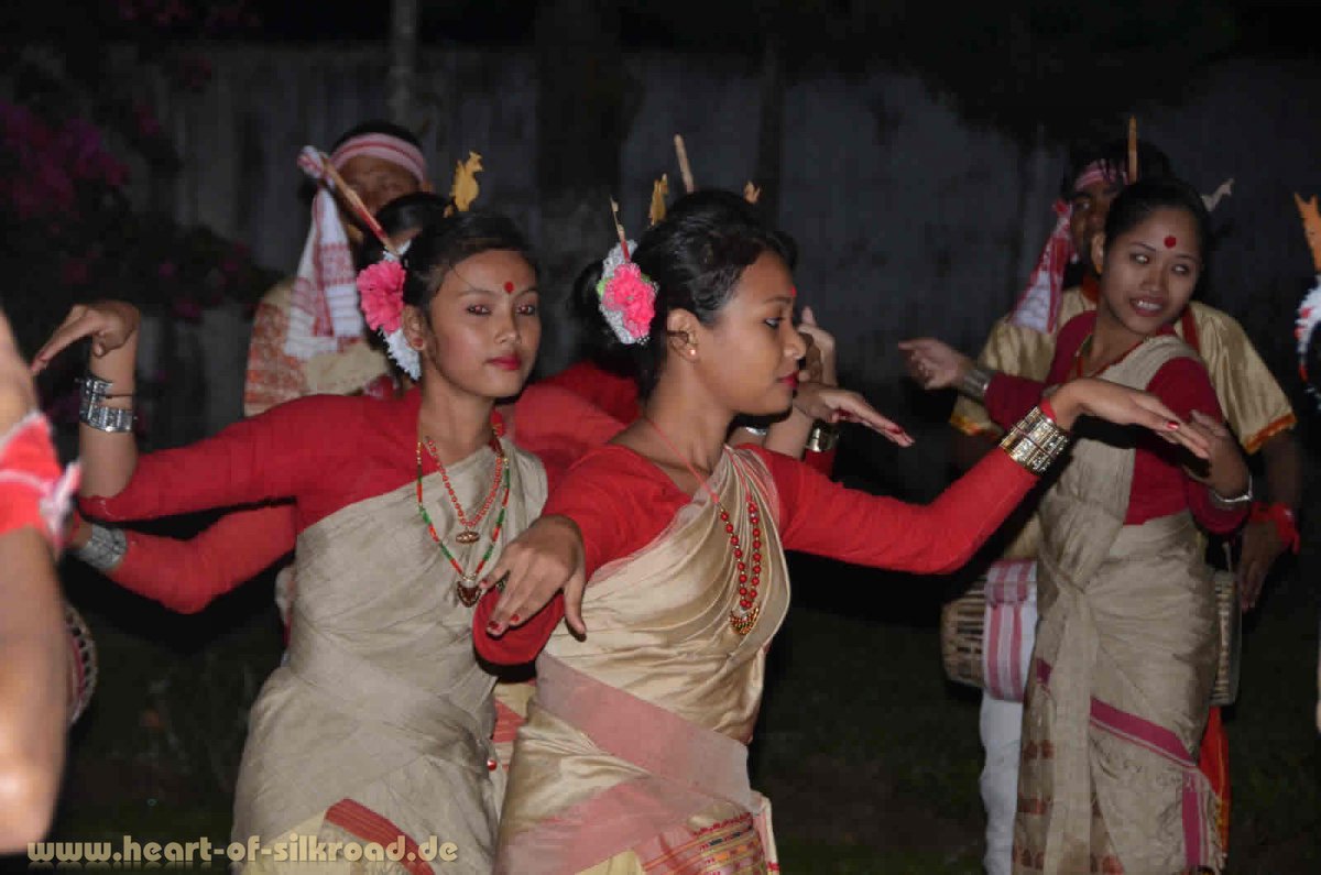 Nordostindien ist mit seinen über 220 ethnischen Gruppen aber auch das Land der Festivals. Man muss nur Augen und Ohren offen halten. Irgendwo wird immer gefeiert, getanzt oder gesungen. Und dann kann man die unterschiedlichen Stämme in ihrer traditionellen Kleidung sehen. Für uns ist das Ras Mahotsav Festival auf der Flussinsel Majuli in Assam sicher ein Höhepunkt unserer Reise. Die Anreise mit dem eigenen Auto auf diese größte bewohnte Flussinsel der Welt ist allerdings nicht so ganz unkompliziert und beim Übersetzen über den Brahmaputra-Fluss werden bei uns wieder die Bilder vom Attabadsee in Nordpakistan ins Gedächtnis gerufen. Zum Glück ist die Fähre hier wesentlich stabiler und so sind wir sehr zuversichtlich die Insel heil zu erreichen. Für die Überfahrt zahlen wir 720 Rupies (ca. 1 USD). Ein Elefant mit Führer kostet immerhin noch 200 Rupies mehr.